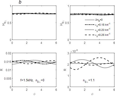 На рис. 4 (для свистовой волны с частотой 0,85 кГц) и 5 (для свистовой волны с частотой 1,5 кГц) изображены зависимости нормализованной амплитуды магнитного поля на земной поверхности (13) (именно эта величина обычно измеряется в наземных обсерваториях) и коэффициента отражения от ионосферы сверху (14) от фазы инфразвуковой волны Графики соответствуют глубине модуляции в инфразвуковой волне и значениям вертикальной длины инфразвуковой волны волны 42 км (1,5), 31 км и 25 км. Графики в левой части рис. 4, 5 соответствуют нормальному падению волны . Графики в правой части рис. 4, 5 приведены для случая что практически соответствует границе «конуса выхода» свистовой волны к земной поверхности. На рис. 6 приведены зависимости коэффициента отражения (14) от фазы для случая наклонного падения с Так как в этом случае волна не достигает земной поверхности, магнитное поле становится на несколько порядков ниже.