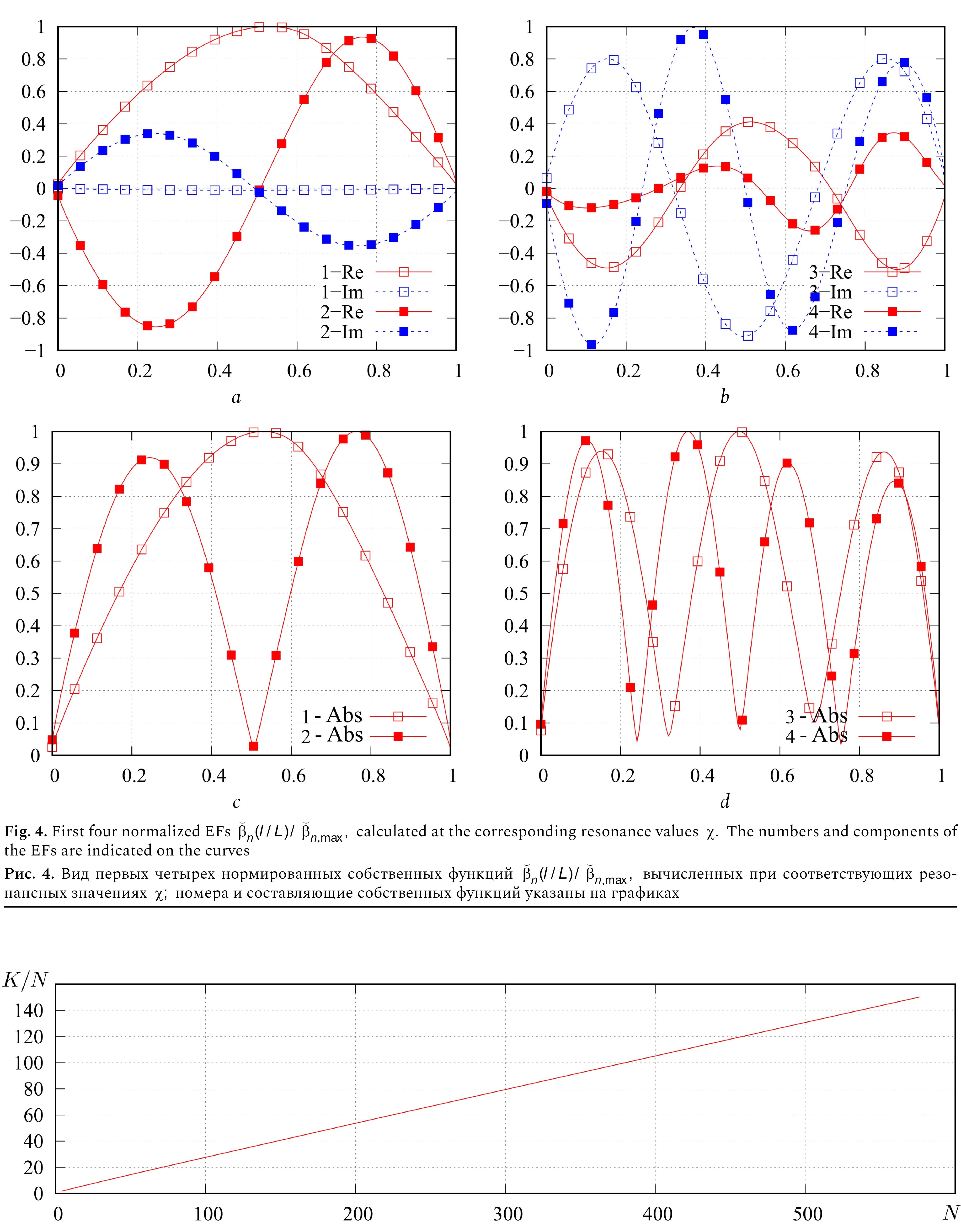 Рис. 4. Вид первых четырех нормированных собственных функций вычисленных при соответствующих резонансных значениях номера и составляющие собственных функций указаны на графиках