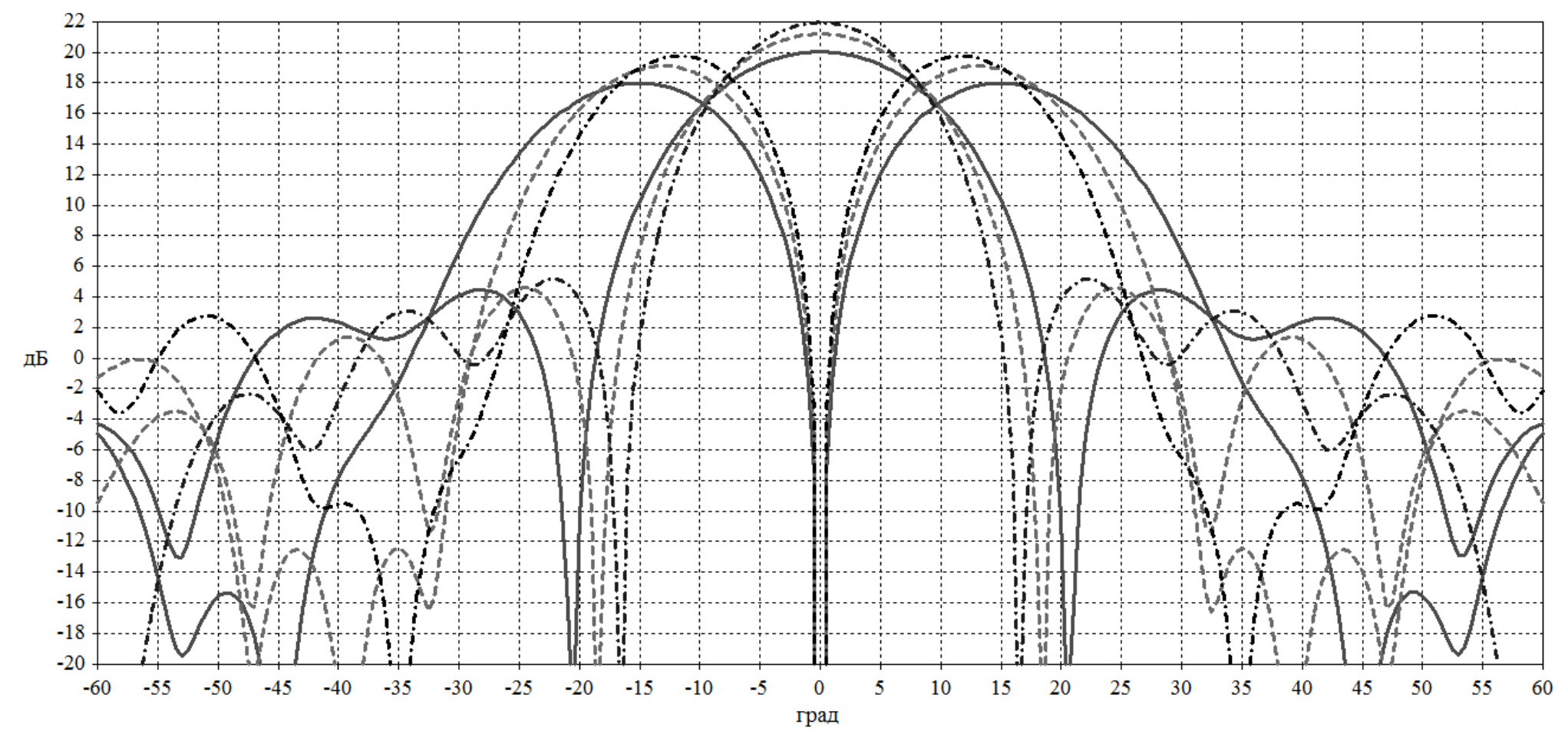 Рис. 4 и 5 содержат суммарные и разностные ДН АР 2 × 2 С(Rx) и суммарные ДН АР 2 × 2 С(Тx) в основных плоскостях на нижних (сплошная линия), средних (пунктирная линия) и верхних (штрихпунктирная линия) частотах диапазонов.