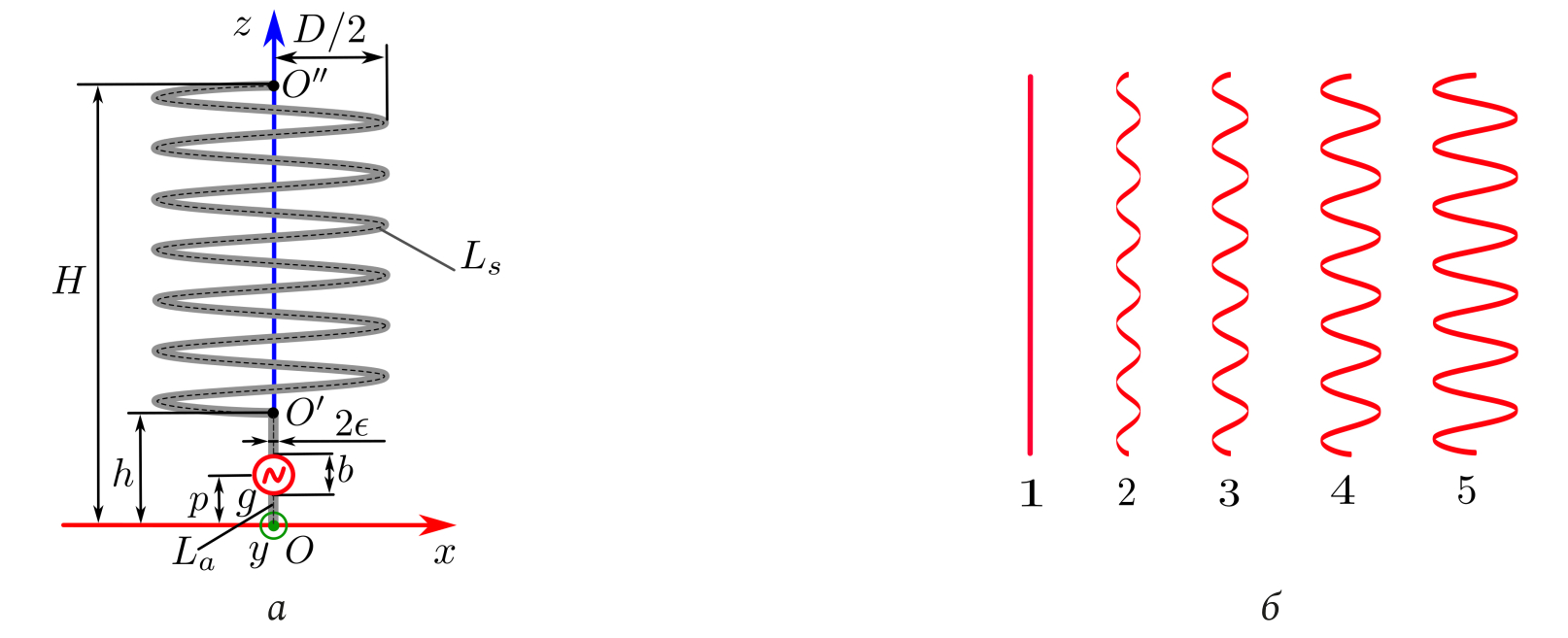 Синусоидальная антенна (СА) представляет собой идеальный проводник круглого сечения, имеющий прямолинейный и синусоидальный участки расположенный над бесконечно протяженным идеальным экраном, лежащим в плоскости XOZ. Радиус проводника равен Геометрия СА показана на рис. 1, а. Здесь – ширина синусоидального участка, – общая осевая длина излучателя, – длина прямолинейного участка Прямолинейный участок имеет разрыв длиной b, центр которого соответствует при этом переменную p в дальнейшем будем называть линейной координатой точки питания. В разрыв помещен генератор ЭДС g, являющийся источником стороннего электрического поля на проводнике. Под действием стороннего электрического поля на проводнике возникает поверхностный электрический ток, распределение которого удовлетворяет уравнениям Максвелла, граничным условиям и условию излучения на бесконечности. Полагая, что где – длина волны, будем считать, что распределение поверхностного тока непрерывно в области зазора. Условие позволяет нам использовать тонкопроволочное приближение, в рамках которого можно перейти от поверхностной плотности тока к полному азимутально-независимому осевому току где – ествественная координата на образующей L проводника Далее также будем использовать условие минимизирующее влияние прямолинейного участка на общее распределение тока.