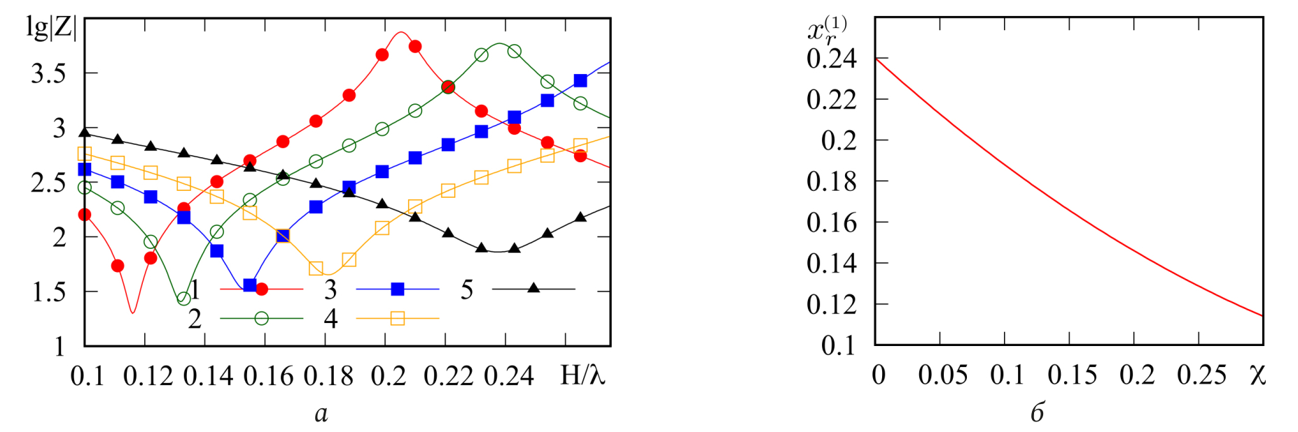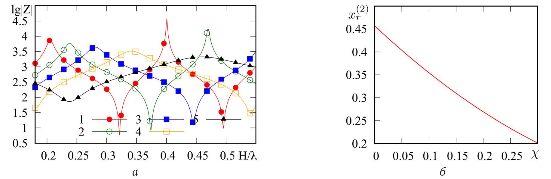 Были исследованы пять вариантов синусоидальной структуры, показанных на рис. 1, б. Отметим, что первый вариант соответствует обычному электрическому вибратору с длиной плеча, равному H. Для всех вариантов 0,06, 0,012, при этом для обоих проводников Число сегментов синусоидального проводника для вариантов 1–5 структуры было равно 79, 132, 175, 220 и 280 соответственно, и подбиралось исходя из условия близости длин сегментов синусоидального проводника к длинам сегментов активного прямолинейного проводника. Число сегментов активного проводника было равным 5. При этом выполнялось условие [6], необходимое для получения устойчивого решения ИУ (4). В диапазоне вычислены распределения токов по образующей структуры, и далее, на основе этих распределений, определены характеристики излучения и зависимости входного сопротивления структуры от x.