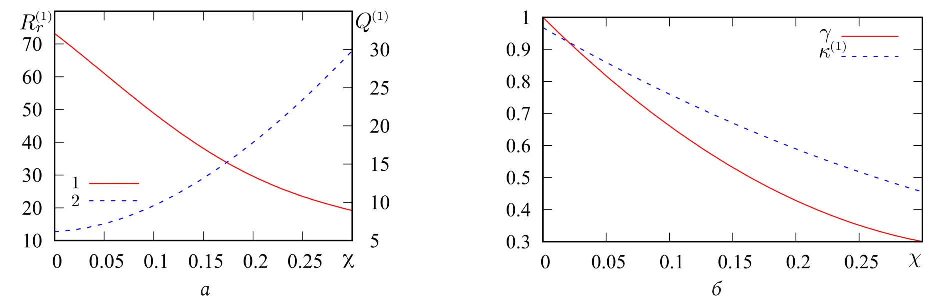 Fig. 3. Dependences of (1) and (2) on (a); dependence of the retardation coefficient and the coefficient of reduction of the electrical length on (b)