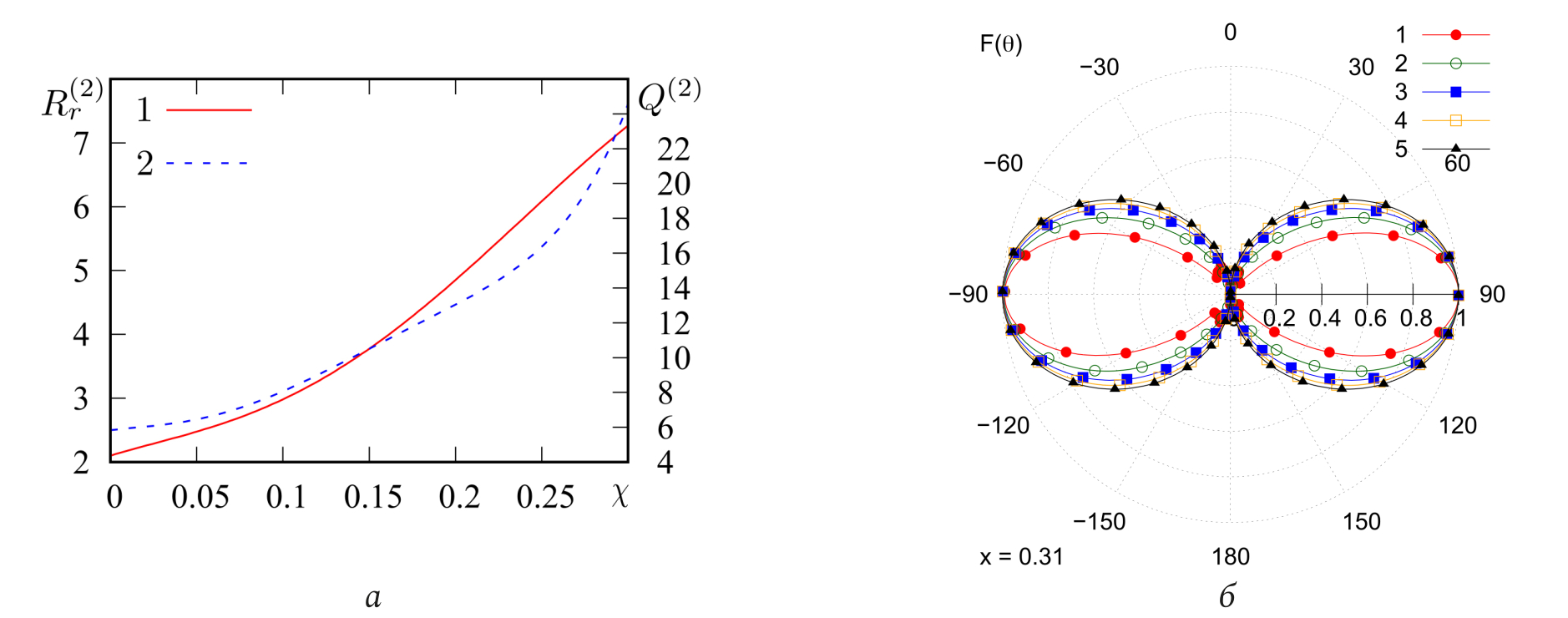 Рис. 5. Зависимости [кОм] и от (а), диаграмма направленности (б) при 0,31: 1 – 0,3; 2 – 0,24; 3 – 0,18; 4 – 0,12; 5 –