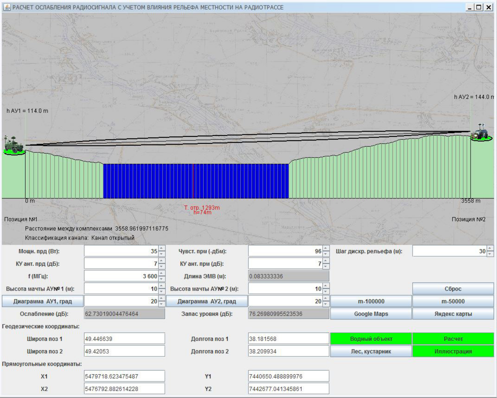 Интерфейс разработанной программы с получаемыми результатами расчета и генерации рельефа местности приведен на рис. 7. Полученные результаты генерации рельефа местности между выбранными местами размещения средств соответствуют визуально определяемым на топографической карте с масштабом 1:100000 уровням высот. Программа осуществляет расчет существенной зоны распространения радиосигнала в соответствии с радиочастотой, классифицирует канал в зависимости от наличия в существенной зоне препятствий рельефа, определяет точку отражения на радиотрассе по принципу равенства углов падения и отражения и проверяет ее принадлежность направлениям диаграмм антенн, осуществляет учет коэффициента отражения у подстилающей поверхности водного объекта в точке отражения и рассчитывает величину интерференционных потерь. Программа также осуществляет точный пересчет геодезических координат мест размещения средств радиосвязи в плоские прямоугольные координаты, которые при необходимости могут быть использованы пользователем.