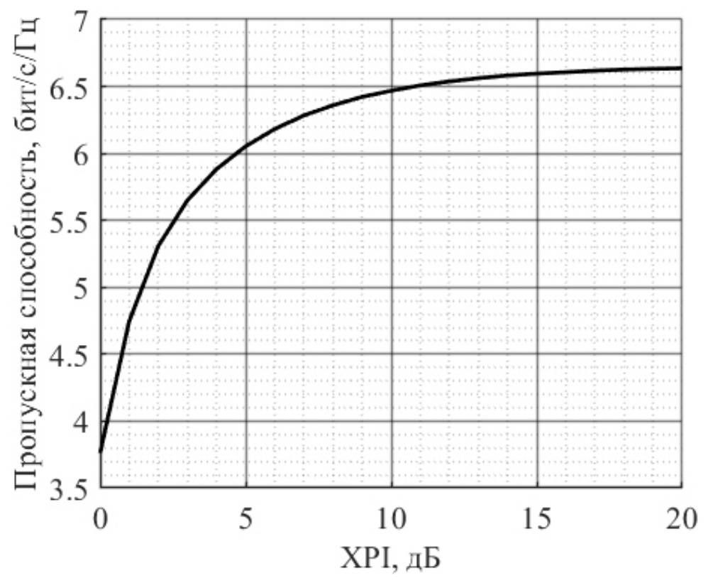 Воспользовавшись выведенными соотношениями и моделью Кронекера, методом Монте-Карло были рассчитаны зависимость пропускной способности для плоской антенной решетки размером 4 × 8 с расстояниями между элементами от величины кросс-поляризации В качестве антенного элемента использовался идеальный двухполяризационный патч с поворотом плоскости поляризации Вероятностное распределение углов прихода по углу места описывалось законом Лапласа, по азимуту – законом фон Мизеса. При расчете использовались допущения для выражения (9). На рис. 1 представлена полученная зависимость. Видно, что уменьшение XPI менее 10 дБ приводит к снижению пропускной способности системы.