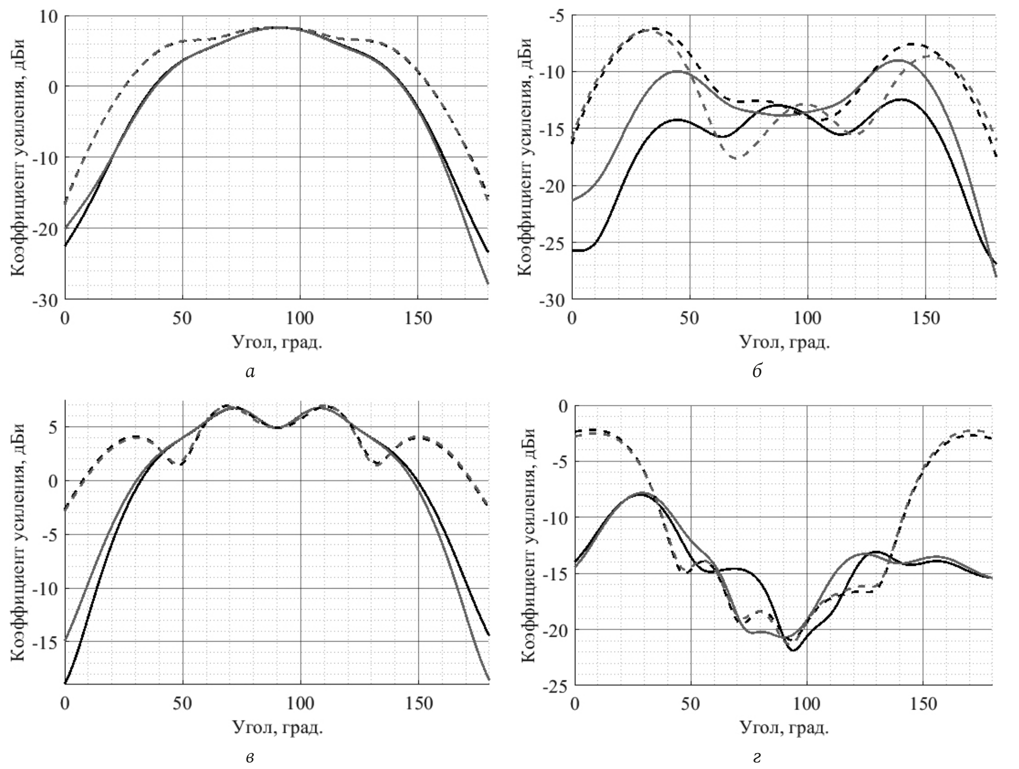 Рис. 2. Диаграммы направленности кросс-дипольного (а – со-поляризационная, б – кросс-поляризационная компоненты) и stacked-патч элементов (в – со-поляризационная, г – кросс-поляризационная компоненты) для первого (черная линия) и второго (серая линия) порта. Пунктирной линией обозначены срезы вдоль направления поляризации порта, сплошной – перпендикулярно)