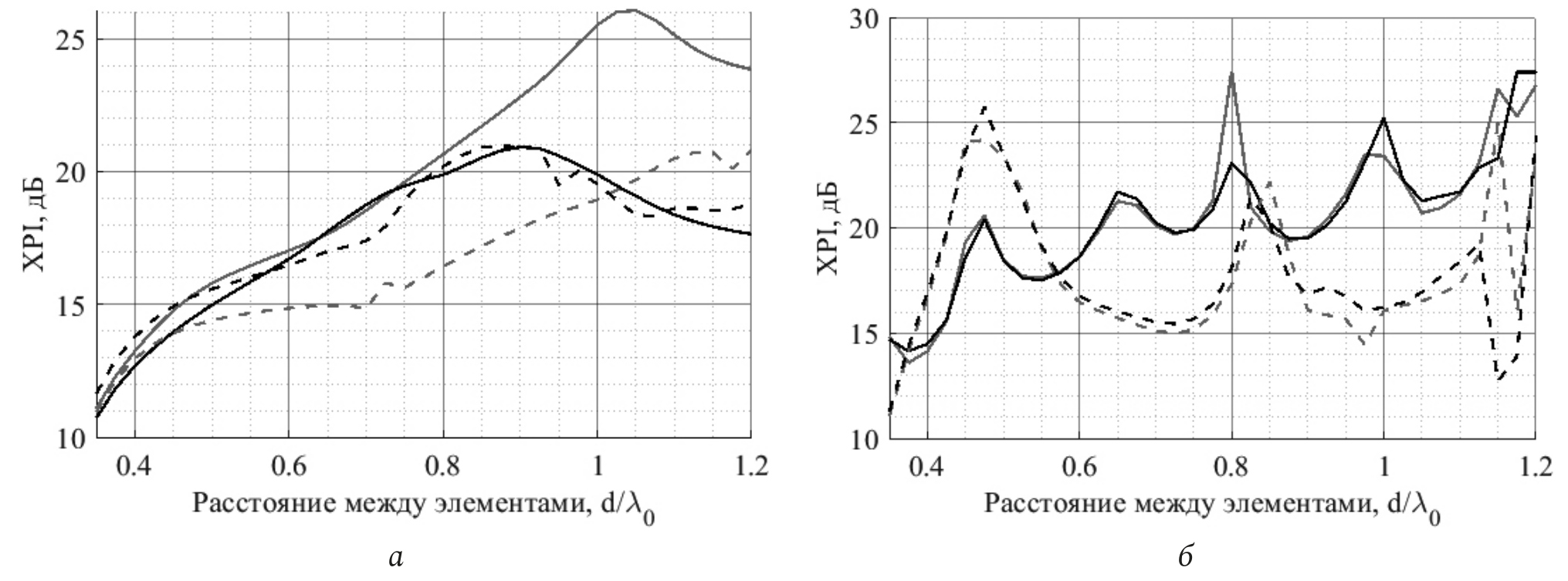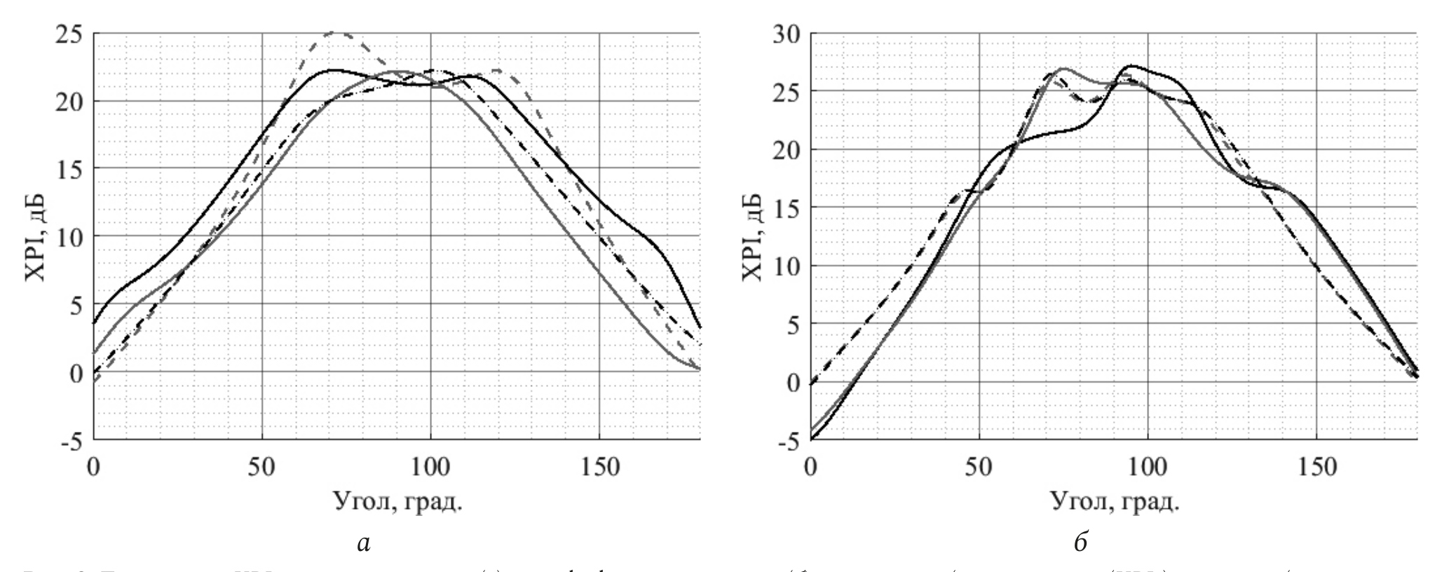 Рис. 4. Среднее значение XPI сдвоенного кросс-дипольного (а) и stacked патч-элементов (б) для первого (черная линия (XPIh) и второго (серая линия (XPIv) порта. Пунктирной линией обозначены срезы вдоль направления поляризации порта, сплошной – перпендикулярно)