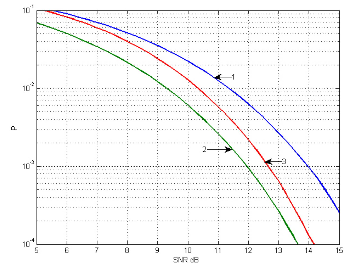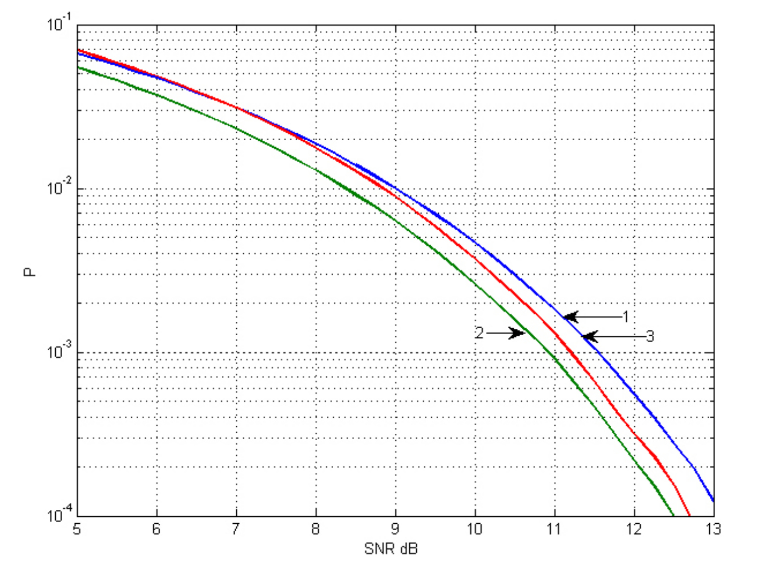На рис. 3 и 4 соответственно представлены аналогичные характеристики ЛВ, в основе которых лежит критерий минимума СКО (MSE–критерий). При этом кривые 1 на обоих рисунках определяют помехоустойчивость «полного» ЛВ, оптимизированного в соответствии с критерием (22), а кривые 2 и 3 определяют помехоустойчивость ЛВ с идеальной и реальной ОСР соответственно.