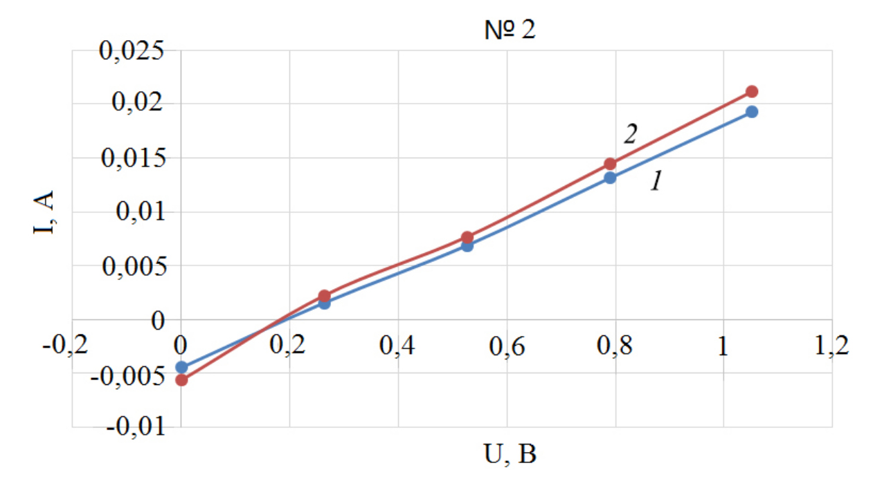 2. Fig. 1. I-V curve of sample #1 after the etching stage (1) and immediately after the first application of quantum dots (2)