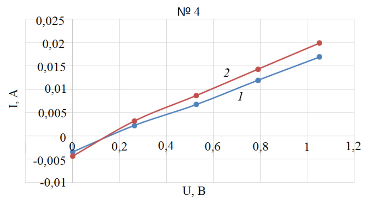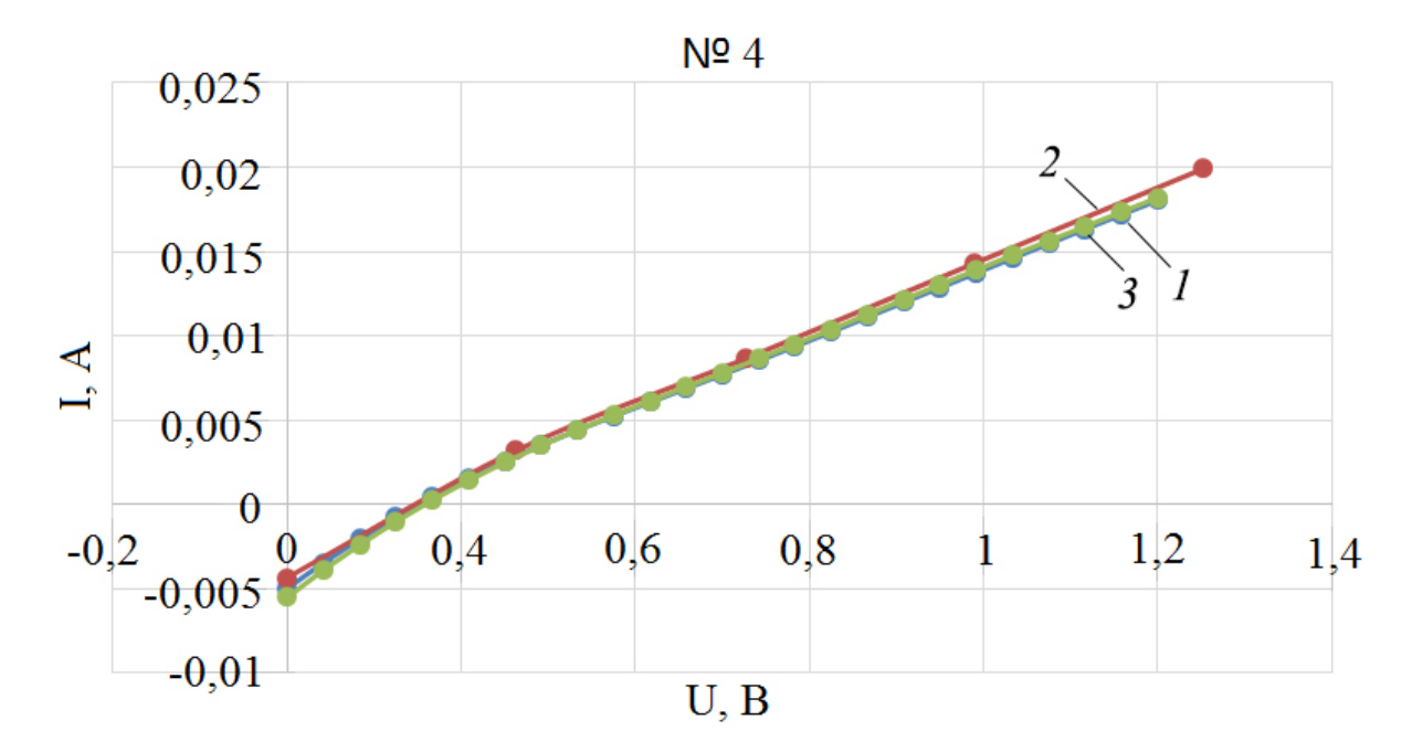 Из графиков видно, что нанесение квантовых точек поспособствовало повышению значений тока у всех образцов. Снижение значения тока образца № 3, соответствующее значению 1,13 В, можно объяснить сбоем измерительного оборудования, что подтверждается дальнейшими исследованиями.