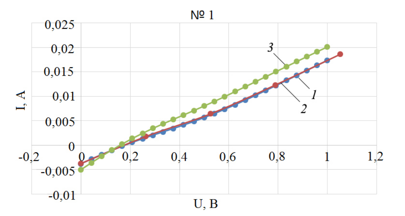 Рис. 5. ВАХ образца № 1 через день после первого нанесения квантовых точек (1), сразу после первого нанесения квантовых точек (2) и сразу после второго нанесения квантовых точек (3)