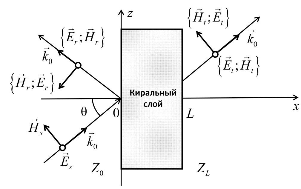 Как видно из соотношений (6) и (7), при решении учтена кросс-поляризация поля, возникающая при падении электромагнитной волны на киральный слой.