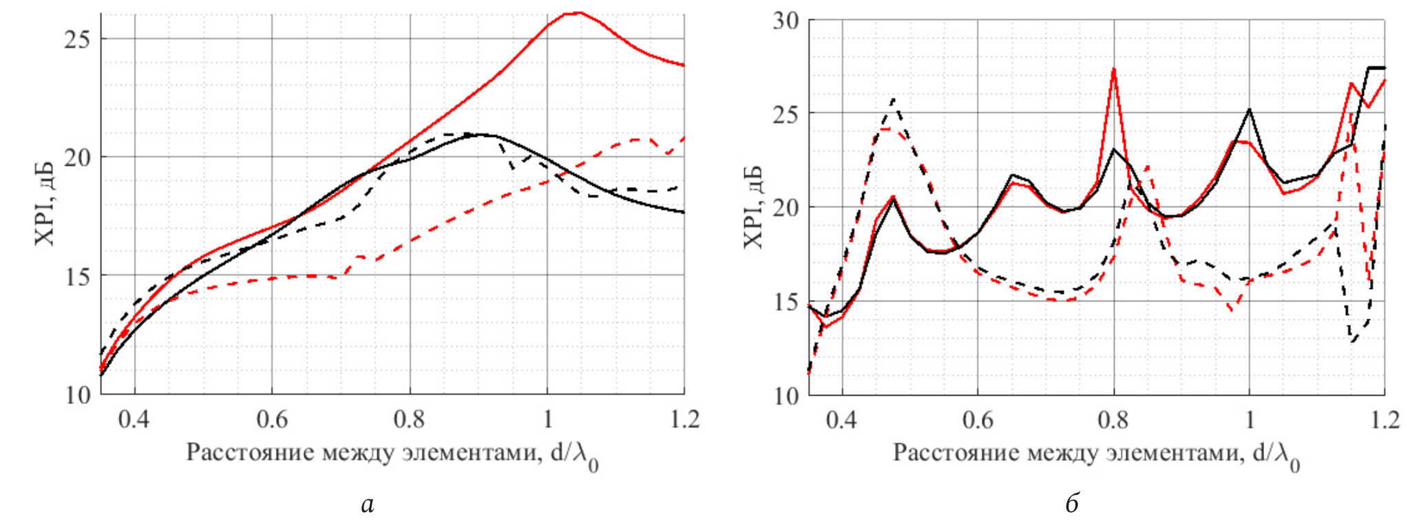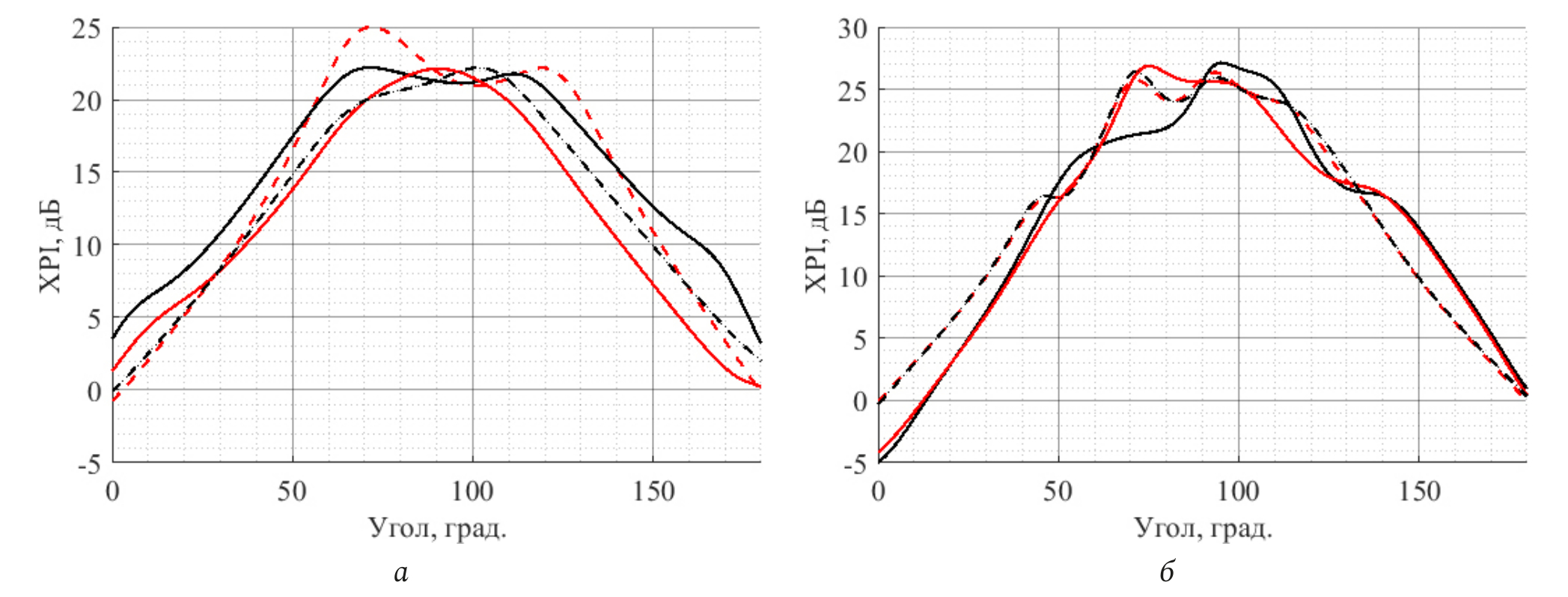 Рис. 4. Среднее значение XPI сдвоенного кросс-дипольного (а) и stacked – патч-элементов (б) для первого (черная линия (XPIh) и второго (красная линия (XPIv) порта. Пунктирной линией обозначены срезы вдоль направления поляризации порта, сплошной – перпендикулярно)