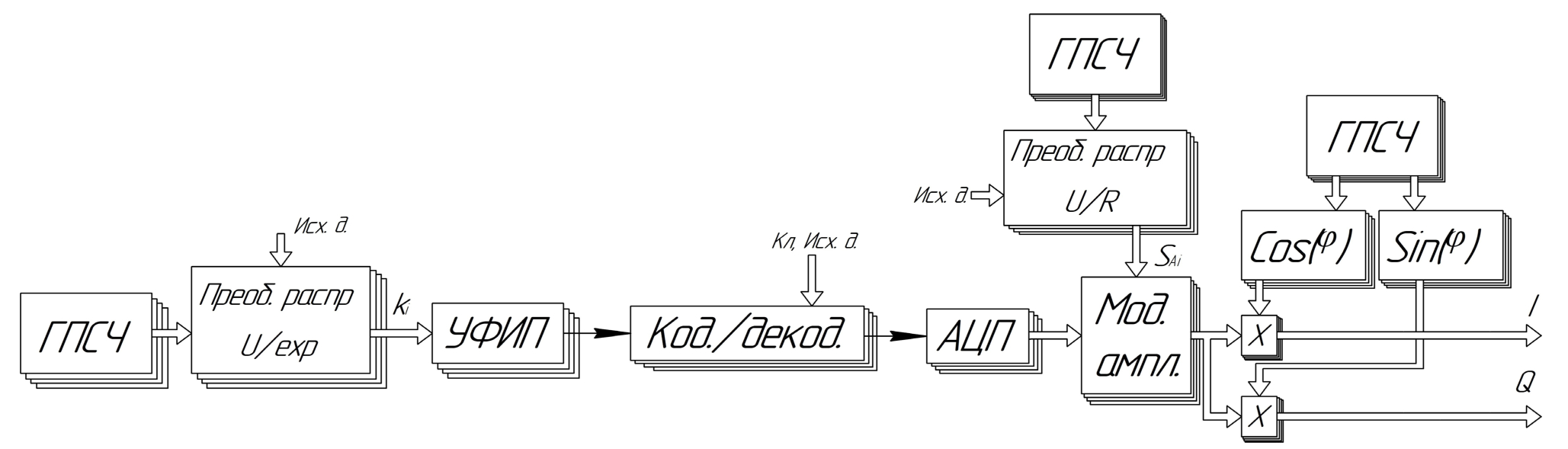 - Блоки и умножители совместно блоками ГПСЧ формируют случайную фазу внутрисистемного потока.