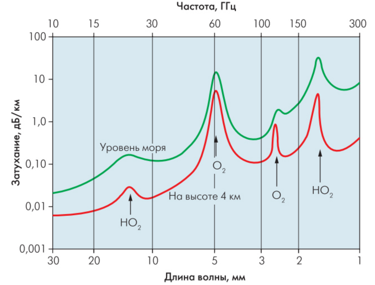 Рис. 1. Ослабление сигнала в воздухе за счет атмосферного кислорода и воды