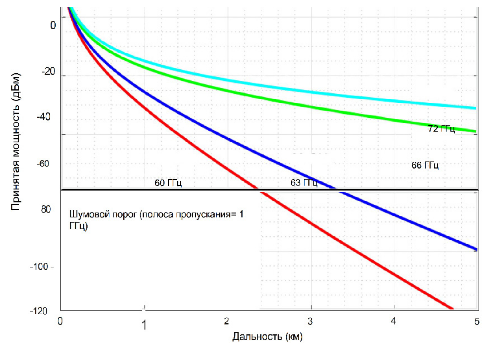 Уменьшение принимаемой мощности при увеличении расстояния передачи может представлять проблемы для безопасности сети: сигнал, достаточно сильный для обеспечения высокой скорости передачи данных, может быть обнаружен, заглушен и взломан. Чтобы уменьшить эту уязвимость, можно использовать частотные области с высоким поглощением в атмосфере. Диапазон 50–90 ГГц – типичное окно непрозрачности, является привлекательным для разработчиков телекоммуникационных систем во многом благодаря тому, что позволяет реализовывать закрытые сети, открывает возможность повторного использования частот, взаимного влияния приемо-передающих устройств и т. п. [5]. Относительно крутая линия поглощения приводит к экспоненциальному увеличению потерь связи с увеличением расстояния и дает возможность настроить «зону безопасности» вокруг каналов сети с хорошей связью внутри зоны и практически не обнаруживаемой и бесперебойной связью в нескольких километрах за пределами поля.