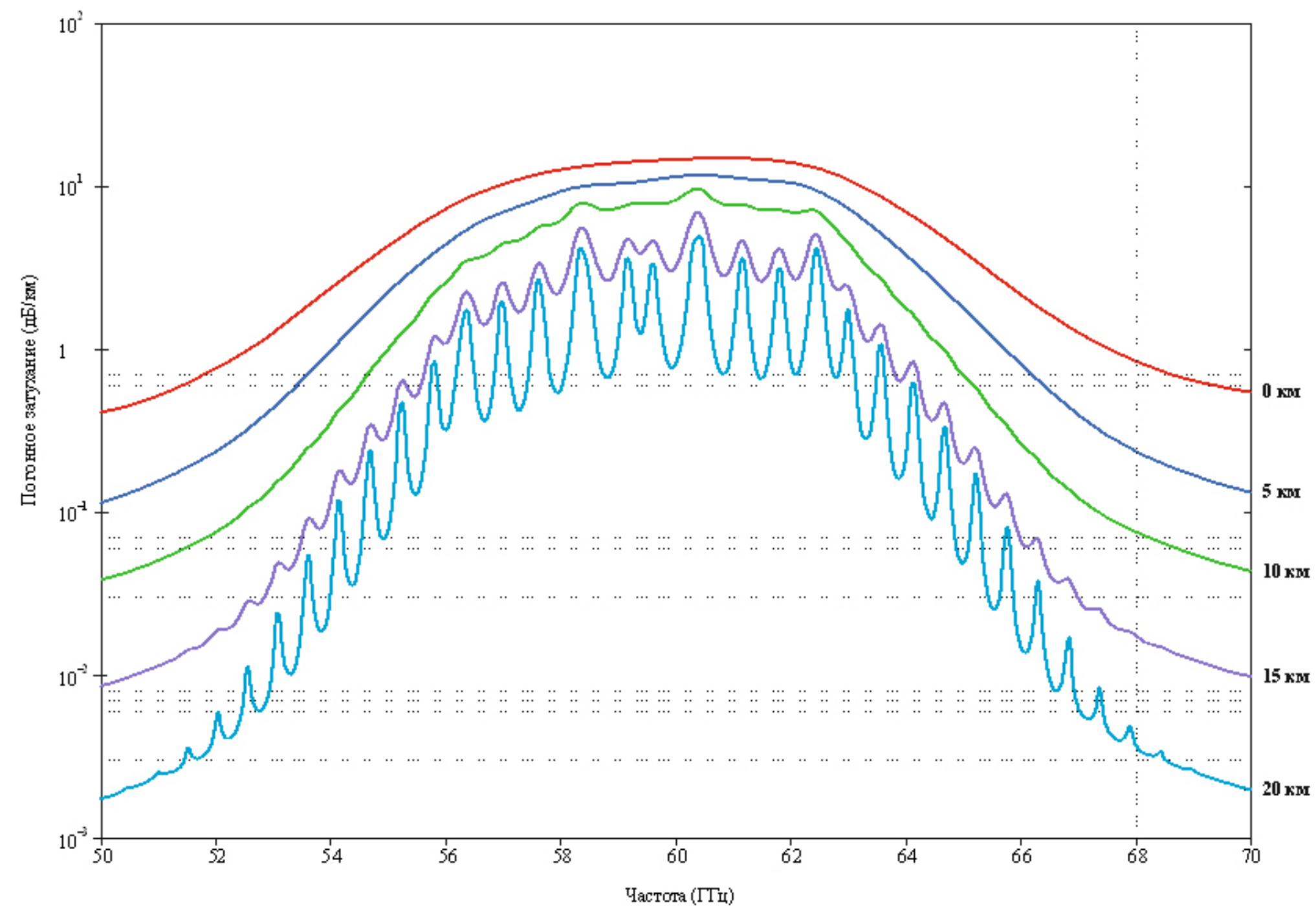 Для больших высот, на которых расположены авиационные беспроводные локальные сети или рои БПЛА(см. рис. 3), атмосферное поглощение уменьшается и становится гораздо более сложным, как показано на рис. 4.