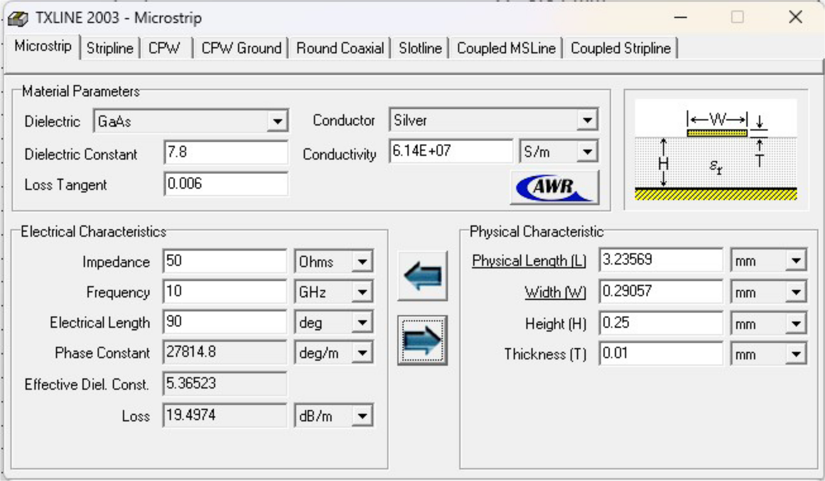 В этом окне установим параметры диэлектрической постоянной Dielectric Constant, то есть нашу диэлектрическую постоянную и тангенс угла диэлектрических потерь Loss Tangent Затем вводим через клавиатуру для параметров MLIN ID = 1 и MLIN ID = 4 Impedance равным 35,36 Ом. А для MLIN ID = 2 и MLIN ID = 3 установим параметр импеданса Impedance равным 50 Ом. В поле Frequency установим 10 ГГц для всех линий. Electrical Length также для всех линий равна 90°. Вводим параметры высоты и толщины Height(H) = 0,25 мм и Thickness (T) = 0,01.