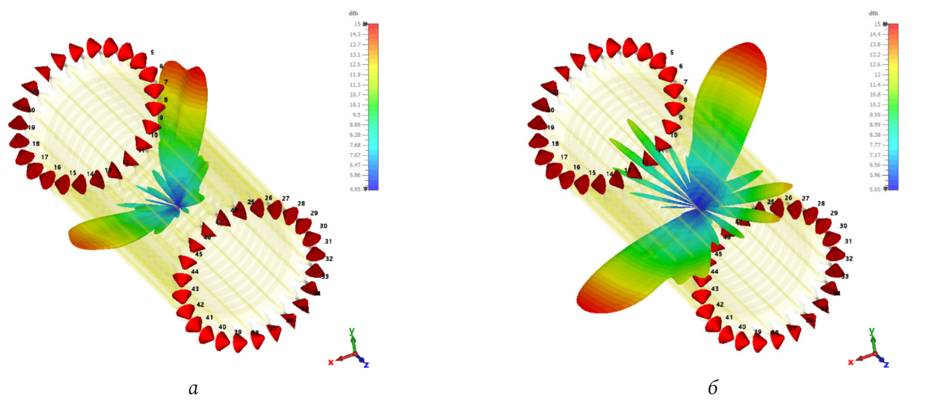 Таким образом, кольцевая антенная решетка позволяет сформировать веерную диаграмму направленности с частотным сканированием, что обеспечивает связь с повышенной помехозащищенностью. Рассмотрим также случай, когда предложенная антенна формирует два луча. На рис. 5 приводится вид диаграмм направленности при запитывании двух пар по 6 портов, которые расположены на противоположных концах антенной системы.
