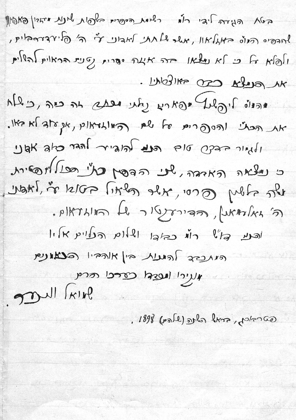 В статье публикуются два письма Самуила Винера, библиотекаря Азиатского Музея в Петербурге в конце XIX в., барону Давиду Горациевичу Гинцбургу, коллекционеру и востоковеду еврейского происхождения. Письма написаны на иврите в 1897–1898 гг., хранятся в архиве Д.Г. Гинцбурга в Российской национальной библиотеке. Через комментированный перевод писем на русский язык анализируются тематика и уровень взаимодействия еврейских интеллектуалов того времени: упоминается ряд известных востоковедов (К.Г. Залеман, Д.А. Хвольсон, О.Э. Лемм и др.), перечисляются купленные бароном книги, еврейские и не только, освещается проблема доставки этих книг в Петербург. Помимо этого, письма являются ярким примером взаимоотношений ученых друг с другом, а также свидетельством комплектования личных библиотек в Российской империи, так как Винер подробно расписывает, за чем «охотились» коллекционеры и как конкурировали между собой.