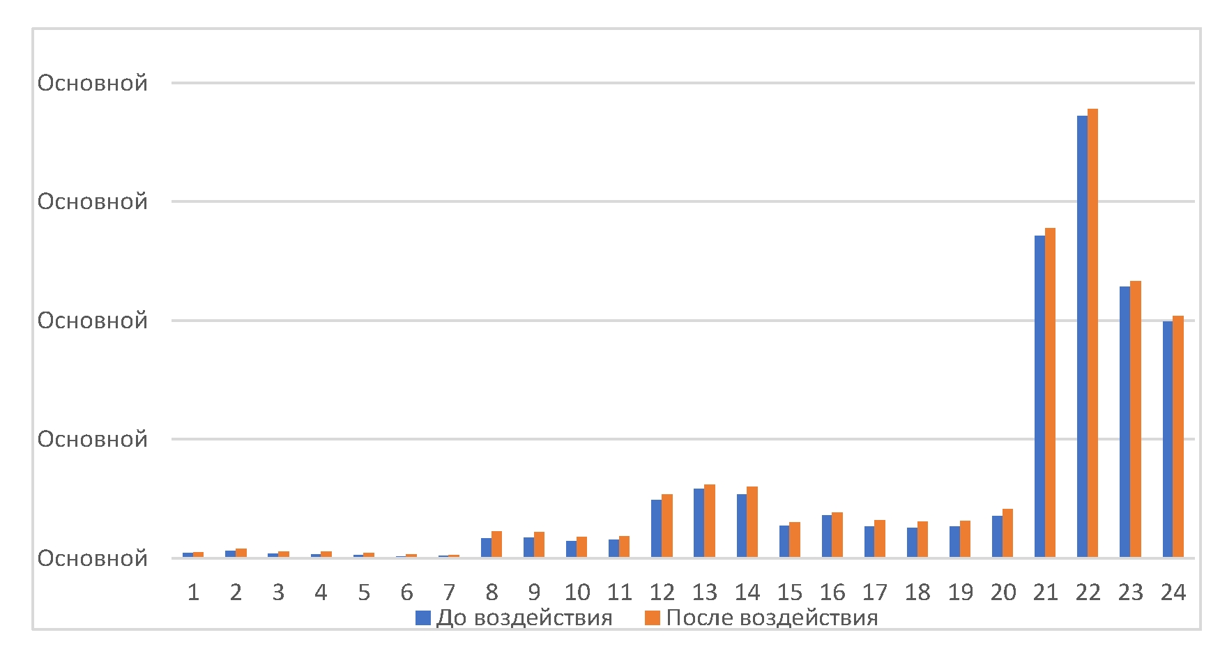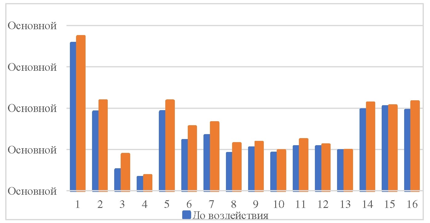 После проведения формирующего эксперимента в зону средних значений переместились все показатели социализации детей с дефицитарным развитием: блок распознавания эмоций (№№ 1–7), блок когнитивных способностей (№№ 8–20), блок нормативного поведения (№№21-24).