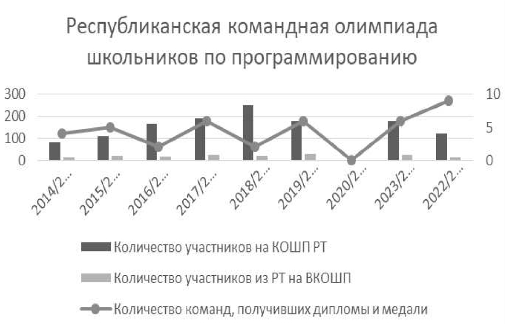 Победители и призеры Республиканского этапа Всероссийской олимпиады школьников по информатике и республиканской олимпиады по информатике для 5-8 классов формируют собой расширенный состав сборной команды, проходящей дальнейшую подготовку к олимпиадам и конкурсам международного уровня. Отличительной особенностью подготовки расширенного состава международной сборной является возможность совместной тренировки учащихся среднего звена, проявивших выдающиеся способности, с учащимися старших классов, победителями и призерами предшествующих этапов значимых олимпиад. Можно отметить, что общее число и уровень сложности задач регионального этапа и республиканской олимпиады одинаковы, поэтому показавшие высокую результативность школьники среднего звена обращают на себя внимание тренеров как будущие чемпионы. Это особенно важно в тех условиях, при которых они получают возможность многолетней подготовки и достижений высочайшей результативности в будущем. Эти ребята получают колоссальный опыт участия и победы в соревнованиях мирового масштаба. Из числа участников расширенного состава сборной республики формируются несколько сборных республики для участия в конкретных международных турнирах и олимпиадах, таких как International Tournament in Informatics, Romanian Master of Informatics, Junior Balkan Olympiad of Informatics, Balkan Olympiad of Informatics. При формировании этих сборных учитываются сильные стороны каждого участника (математические, логические, программистские навыки) расширенной сборной и та сфера деятельности, в которой он способен реализовывать собственные способности и усвоенные знания. Ежегодно учащиеся Республики Татарстан (члены республиканской сборной) завоевывают право выступать за сборную Российской Федерации на самых престижных соревнованиях по олимпиадному программированию среди школьников, таких как International Olympiad in Informatics (Международная олимпиада по информатике), European Junior Olympiad in Informatics (Европейская юношеская олимпиада по информатике). Среди учащихся республики есть золотые медалисты данных олимпиад 2018, 2019, 2021, 2022 гг. Ежегодно сборная республики завоевывает около 20 медалей различного достоинства на международных олимпиадах и турнирах. Тренерский состав Республики Татарстан осуществляет подготовку, предоставляет площадки для командных олимпиад школьников по программированию и проводит отбор на Всероссийскую командную олимпиаду школьников по программированию в Санкт-Петербурге. Ежегодно в этих мероприятиях принимают участие около двухсот школьников республики. В 2022/2023 учебном году 11 команд представили Республику Татарстан в финале олимпиады в Санкт-Петербурге, где 6 из них стали обладателями дипломов различного уровня. Отметим, что в Республике Татарстан существуют площадки всех олимпиад 1 уровня РСОШ по программированию. Университетом Иннополис разработана и проводится престижная уникальная олимпиада по информатике 1 уровня РСОШ Innopolis Open. В отборочном этапе принимают участие более шести тысяч школьников России, стран СНГ, ближнего и дальнего зарубежья. В финал проходят около ста пятидесяти учащихся. Чтобы поддерживать столь высокий интеллектуальный уровень учащихся и мотивировать их на дальнейшее развитие собственного потенциала, Университет Иннополис при поддержке Министерства образования и науки Республики Татарстан орга