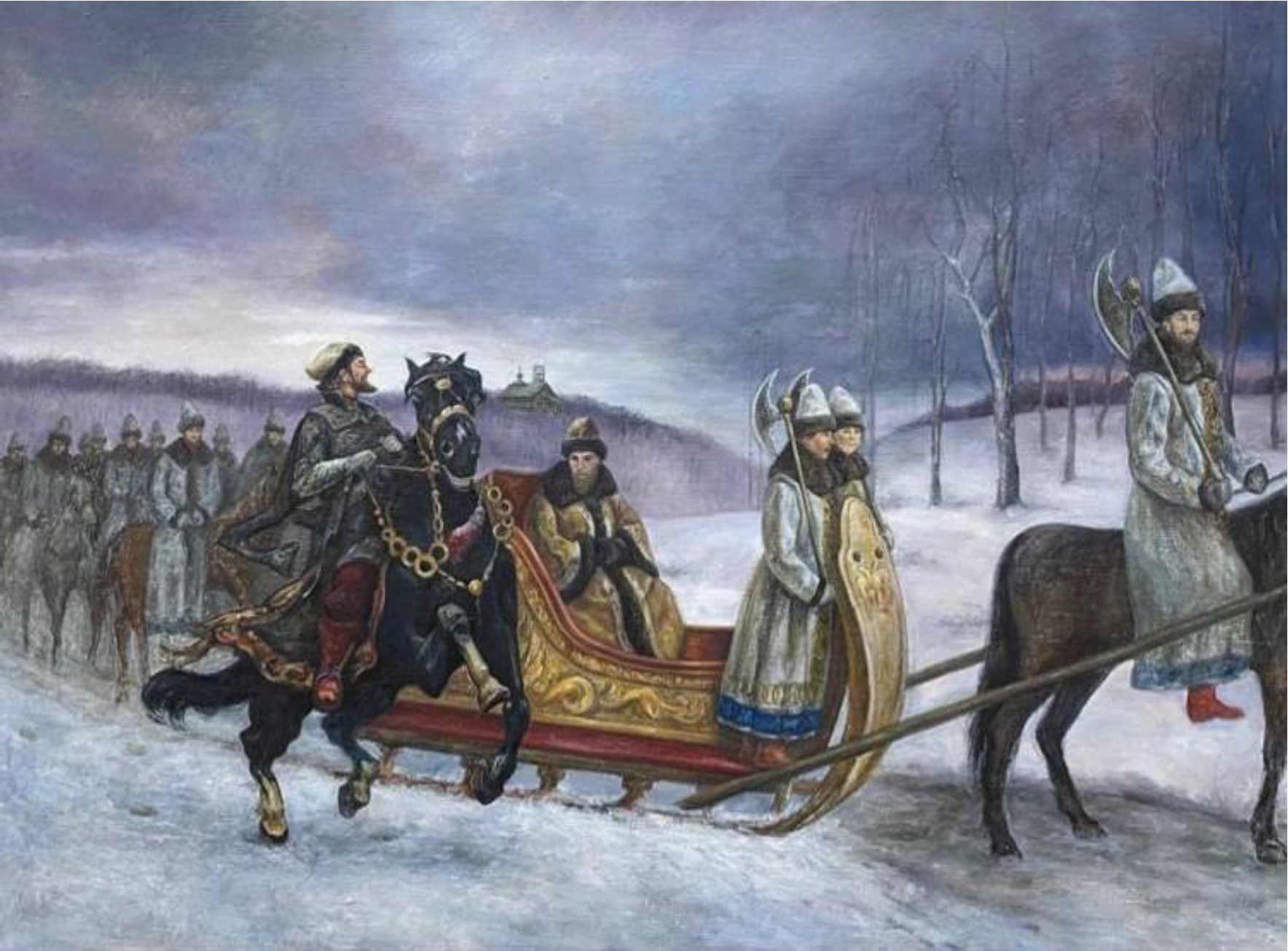 Экспозиция была представлена Раису Республики Татарстан Р.Н. Минниханову, Председателю Национального Совета Всемирного конгресса татар В.Г. Шахразиеву, первому заместителю председателя Совета муфтиев России и Духовного управления мусульман РФ Р.Р. Аббясову, которые высоко оценили вклад студентов-живописцев и их преподавателя в развитие проекта. Репродукции работ были использованы при создании книги под названием «Московия: рождение двуглавого орла», экземпляры которой вместе с благодарственными письмами были вручены Р.Р. Аббясовым всем художникам и руководителям проекта. Работы были переданы Духовному управлению мусульман Московской области и были экспонированы на галерейных площадках городов Казани, Коломны, Москвы. В данной статье представлена одна из работ проекта – «Два царя» (60х80 холст/масло), работа студентки 5 курса M. Зариповой. На картине изображена зимняя дорога в окрестностях Сергиева Посада. Сквозь лес видны купола Успенского собора, по дороге едут сани, в которых сидит Симеон Бекбулатович в царских одеждах, рядом с ним – Иван Грозный на грациозном черном коне (Рис. 1).