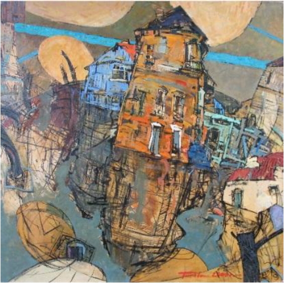 В станковых произведениях «Окраина» и «Муравейник» (рис. 3, рис. 4), применен метод стилизации, прием трансформации объектов и среды. Создана новая реальность: утрированы пропорции объектов, применена криволинейная и прямолинейная пластика графического композиционного решения, выделены цветовые пятна объектов в графическом хаосе разнообразных линий. По словам эксперта Е.О. Соколовой: «Обобщенность и упорядоченность познания человеком окружающей действительности заложена на уровне восприятия…» [11]. Визуальное восприятие образов подтверждает мнение, что сознание упорядочивает данный линейный хаос в восприятии динамичных пятен, составляющих структуру работ. В произведениях художественный образ создан воспоминаниями об объектах, их среде, с элементами новизны в композиционном, стилевом решениях. Проводя сравнительный анализ с реалистическими работами, декоративные стилизованные произведения в стиле экспрессионизма производят эмоциональный эффект.