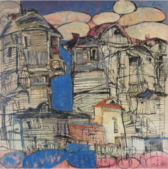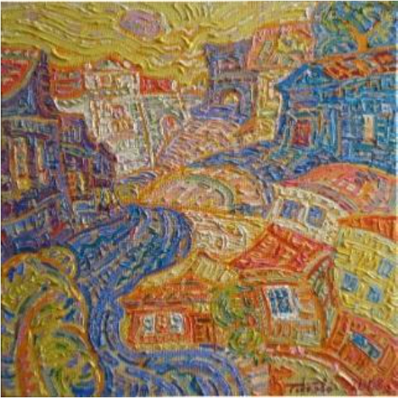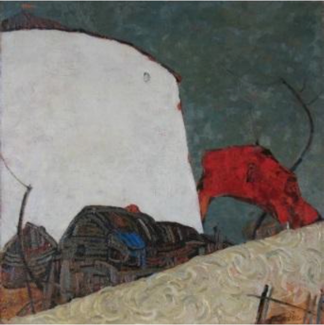 Рис. 7. Пейзаж с белой башней. 80х80, холст, масло, акрил, 2002 г.