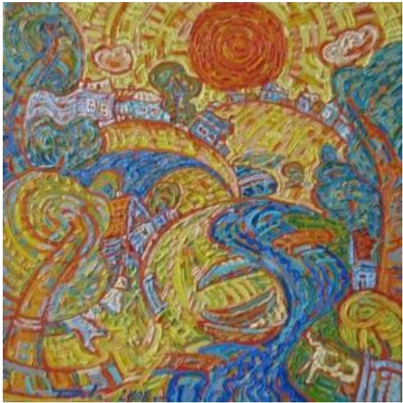 В живописных произведениях «Душевная» (2008 г.) (рис. 5) и «Солнечная» (2008 г.) (рис. 6), криволинейная пластика в контрастном цветовом решении на противопоставлении дополнительных цветов является средством для гармоничного результата. Работы отличает импрессионистическое полицветное-мазковое наложение масляной краски на поверхность. Важную роль играет красная линия, красным цветом обозначен рисунок композиции, линия объединила цветовые пятна. В данных произведениях наблюдается: «Процесс творческой переработки объектов окружающей среды при художественном обобщении, с целью выявления характерных декоративных качеств» [5]. Сравнивая с реалистическими работами с точки зрения выразительности образного решения, указанные стилизованные произведения производят более эмоциональный эффект благодаря цвету, фактуре и пластике. Творческая методика по разработке стилизованной среды должна развивать пластическое понимание формы, обучающемуся творческим методам необходимо выполнять разнообразные пластические решения с применением линии и пятна как выразительных средств изобразительного искусства. Одно из заданий обучения может быть - преобразование рисунка в декоративный образ, последовательно его трансформируя [6]. Особое внимание при осуществлении данной методики должно быть направлено на пластическую фактурную составляющую.