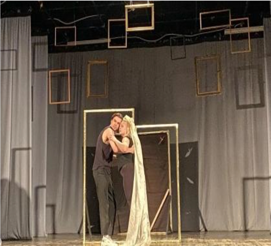 Образ среды спектакля решен ограниченными средствами в рамках сменяющихся картин развития фабулы пьесы. Подвесные рамки над пространством спектакля символизируют окна домов на узкой улице Неаполя (рис. 3). Зрительская фантазия сама конструирует картины происходящего в этих окнах. В спектакле выделены моменты, где действующие лица входят в рамки и в этот момент меняется ритм их речи, затем, когда они выходят за рамки, речь и ритм меняется вновь. В рамках представлены картины пережитых в прошлом прекрасных мгновений юношеской мечты о любви в возвышенном спокойствии и величии. Выход из картины прошлого, запечатленного в фотографиях и семейных портретах, означает возвращение в бытовую приземленность (рис. 4). Структура спектакля наполнена такими переходами из картины прошлого действующих лиц в настоящее и наоборот. Эти переходы требует от актеров гибкости психологического наполнения, содержащего как возвышенную романтику, так и жесткую холодную приземленность. От артиста требуется быстрота переключений с одного состояния на другое. Это переключение должно быть не формальным, но наполненным искренними чувствами. Режиссер-постановщик и художник могут задать определенную форму и задачу сценической реальности, которую артисту необходимо оправдать и наполнить эмоциями, ощущениями, переживаниями.