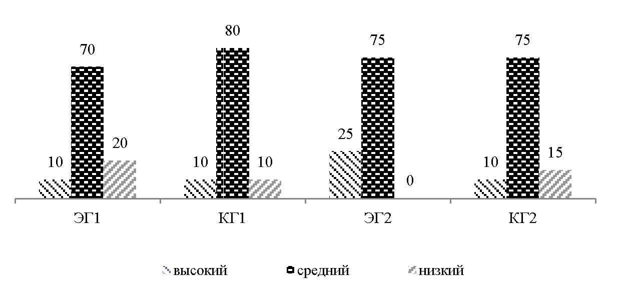 Из рисунка видно, что в экспериментальной группе (ЭГ1 – экспериментальная группа на констатирующем этапе эксперимента, ЭГ2 – экспериментальная группа на заключительном этапе эксперимента), количество учащихся с высоким уровнем эмпатии возросло на 15 человек и составило 25% (27 испытуемых), средний уровень – увеличился на 5 младших школьников, составил 75% (81 обучающийся), низкий уровень у младших подростков снизился на 21 человека и в заключительном этапе эксперимента не был выявлен.
