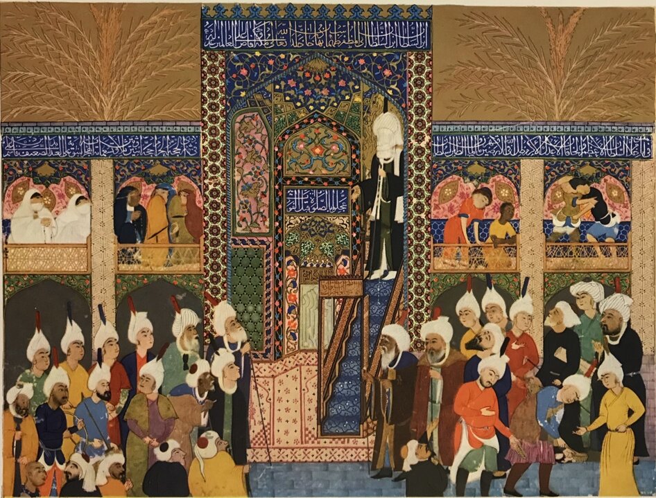 Рис. 2. «Последняя проповедь Пророка Мухаммеда». «Ахсан ал-Кибар» Мухаммада ал-Хусайни ал-Вирамини. («Лучшие из великих людей. Предания о жизни праведных имамов»). Предположительно Касим Али. 1526 г. Российская национальная библиотека, Санкт-Петербург. Dorn 312, 313.