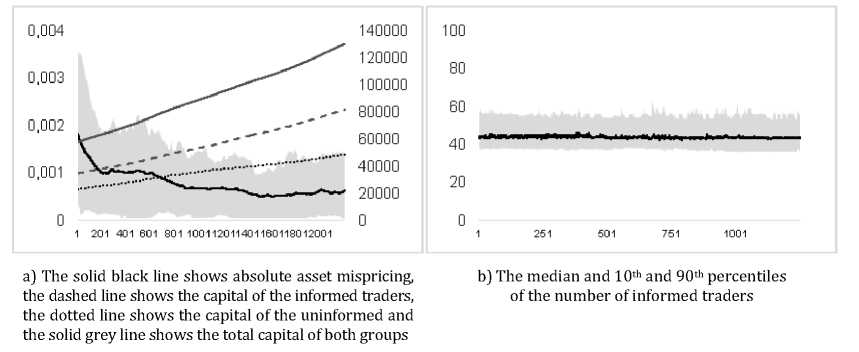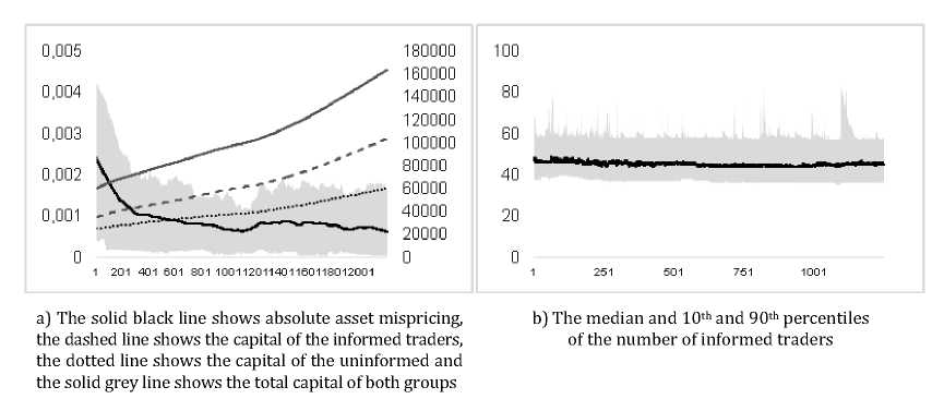 Fig. 2b-11b show the median number of informed traders across simulation runs (solid line) as well as the 10th and 90th percentiles of this number shown in light grey margins around the line. We report these data for the last 1300 periods of simulation runs, as the numbers of informed traders converge to stable values only after this cutoff.