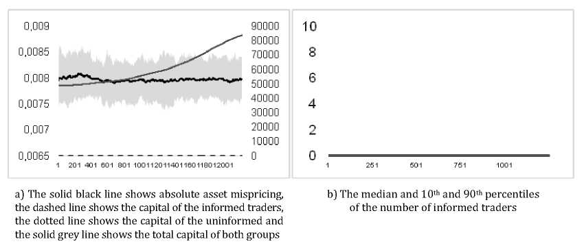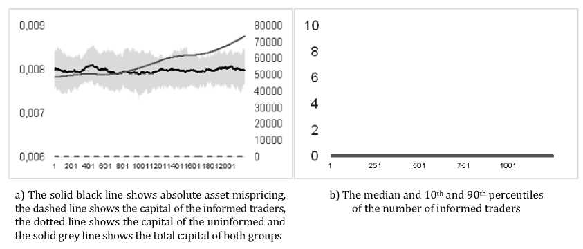 However, our main and most surprising finding emerges when one compares Fig. 2a and 3a, showing the results for the information costs 0$ and 0.02$, respectively. We can observe that when the cost of information transitions from a positive value to zero, the capital accumulation by the informed traders in the first half of the simulation is actually slower than that of the uninformed ones. Eventually the informed traders manage to overtake the uninformed ones in terms of accumulated wealth, but paradoxically, this happens much later compared to the case where the cost of information is slightly positive (Fig. 3a–6a). This finding is further strengthened by Fig. 2b and 3b which show the numbers of the informed traders. The 10th percentile of informed traders is actually lower for the case with the information cost of 0$ than for the cases with C = [0.02, 0.08]. In fact, for the slightly positive information costs, the number of the informed traders is never zero at the 10th percentile level. The relative wealth dynamics of the informed and uninformed traders find their reflection in the mispricing dynamics, with the mispricing being higher (at least in the initial periods) for the information cost of 0$ than 0.02$.
