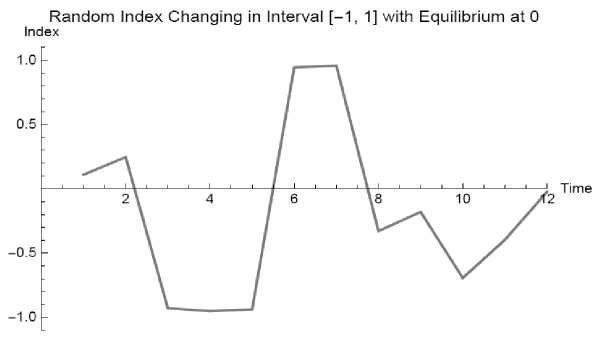 Поведение рынка денег и долга во времени задается осцилляциями индексов и , где абсолютная величина амплитуды характеризует максимальное уклонение долга (или денег) от состояния равновесия. Динамика этих индексов удовлетворяет условиям стационарности[6], что видно, например, на рис. 5, где случайная динамика индекса долга смоделирована программой Mathematica 10, составленной системой ИИ [AI LMSYS, 2024].