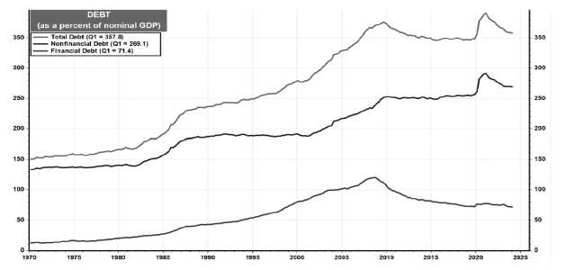 Следствием финансиализации явилась гигантская, иерархически организованная, система контрактов, прежде всего, долговых. Номинальная стоимость глобальных макрофинансовых обязательств в 2024 г. превысила 3 ´ 1014 долл. (при мировом ВВП порядка 100 трлн долл.) [IIF, 2024]. Можно утверждать, что в современных условиях макродолг, как многомерная система финансовых (долговых) контрактов, диктует важнейшие параметры развития всей социально-экономической системы.