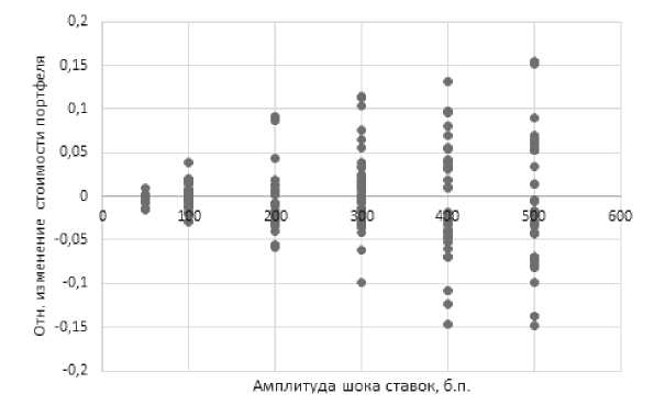 Рис. 1. Изменения относительной стоимости иммунизированного портфеля при случайных шоках ставки различной амплитуды