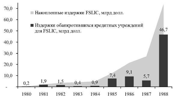 Последствием кризиса 1980–1989 гг. стало банкротство Федеральной корпорации страхования сбережений и ссуд (FSLIC), которая осуществляла страхование вкладов ссудо-сберегательных и кредитных учреждений. На момент кризиса 1980–1989 гг. FSLIC ликвидировала 296 учреждений на сумму 125 млрд долл. [Curry, Shibut, 2000]. За первые три года FSLIC ликвидация неплатежеспособных учреждений обошлась FSLIC в 3,5 млрд долл., за 9 лет с 1980-го – в 73,4 млрд долл. [FDIC, 1997].