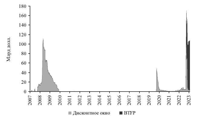 Рис. 6. Объем поддержки банковского сектора через программу дисконтного окна и программу BTFP Источник: FRB.