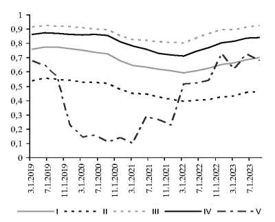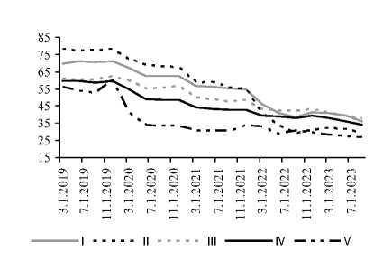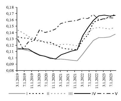 Рис. 14. Динамика среднего отношения ценных бумаг до погашения ко всем ценным бумагам 2019–2023 гг.
