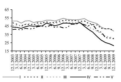 Рис. 16. Динамика медианы доли незастрахованных депозитов разных моделей американских банков в 2003–2009 гг. Источник: FDIC, расчеты авторов.