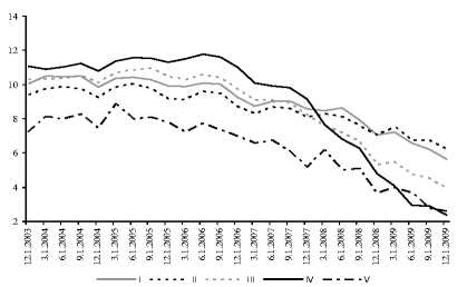 Примечание: в рис. 12–16 классическая модель (I), классическая модель с акцентом на инвестиции (II), классическая модель с акцентом на займы (III), классическая модель с акцентом на займы и высокой долей незастрахованных депозитов (IV), торговая модель (V).