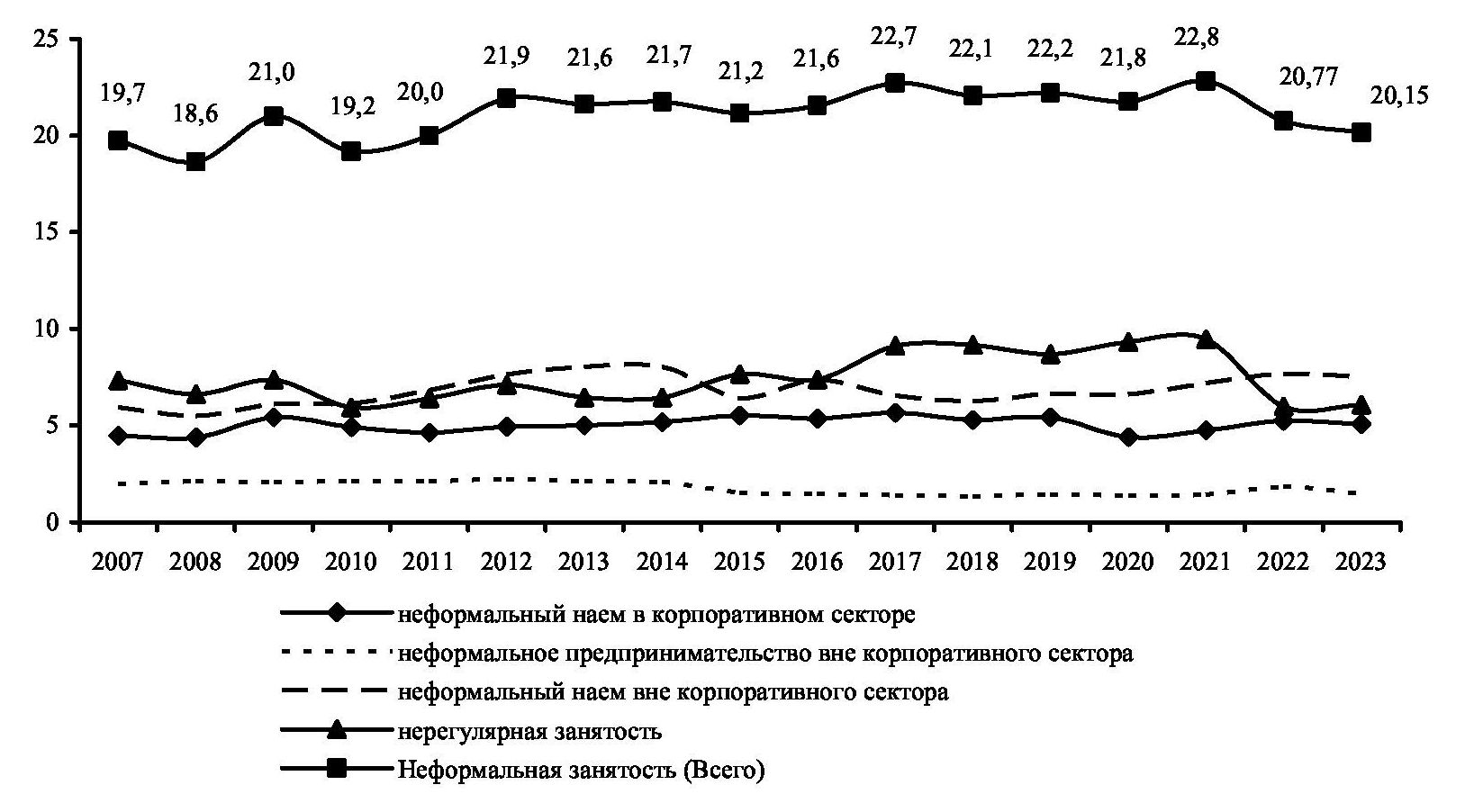 На первом этапе рассматривалась динамика общего уровня неформальной занятости и ее различных типов в 2007–2023 гг.