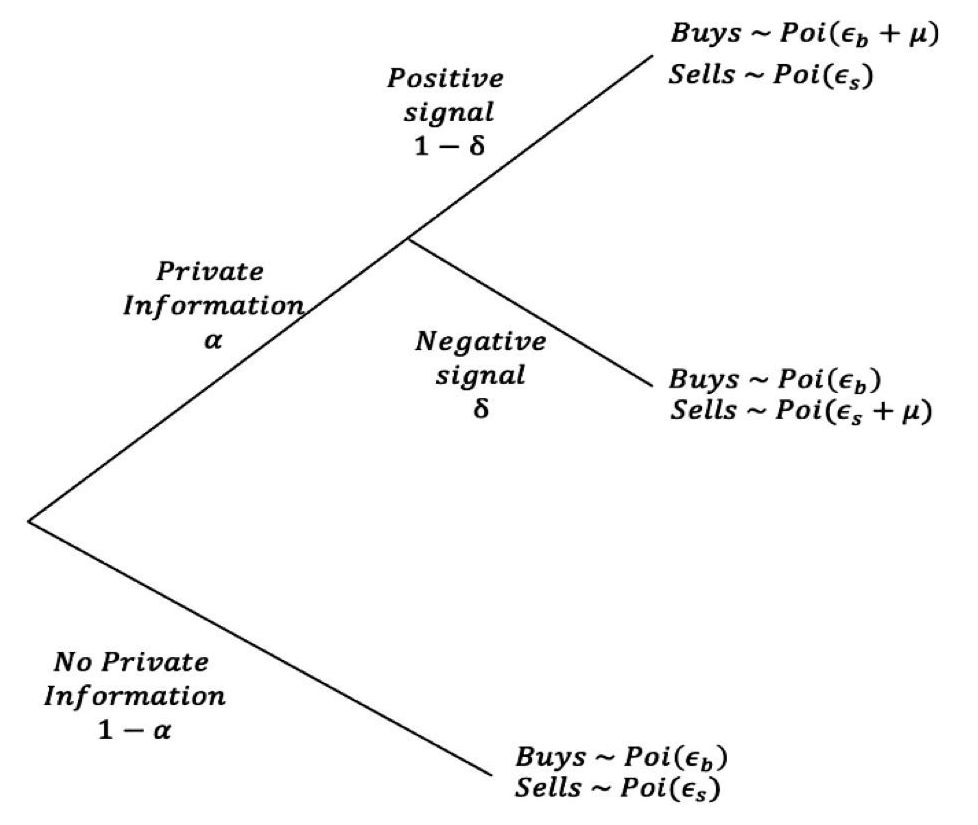 1 This diagram represents the trading mechanics, described on the previous page, where and stay for probability of private information event, probability of negative signal, rate of uninformed buy and sell operations rates and informed trade arrival respectively.