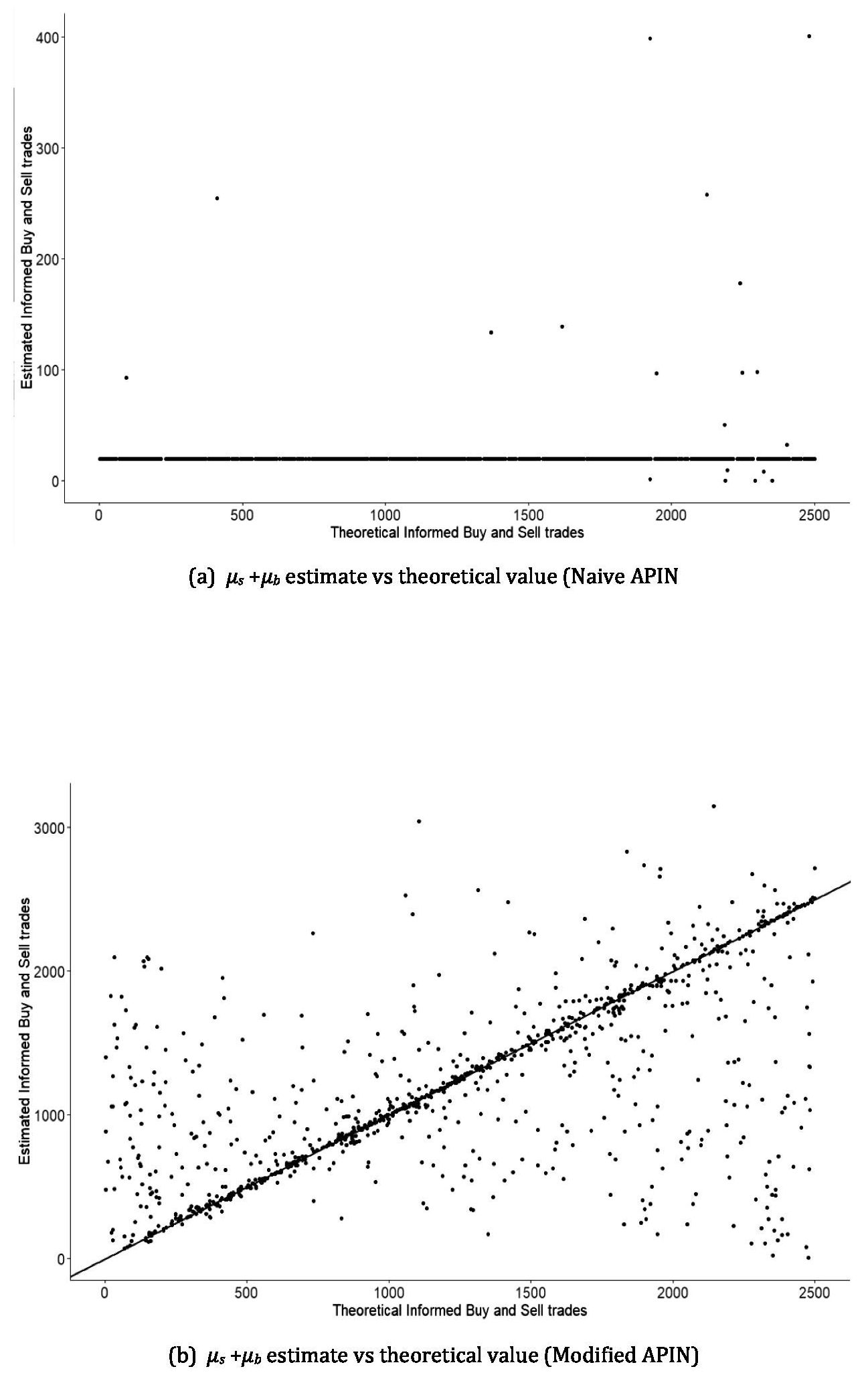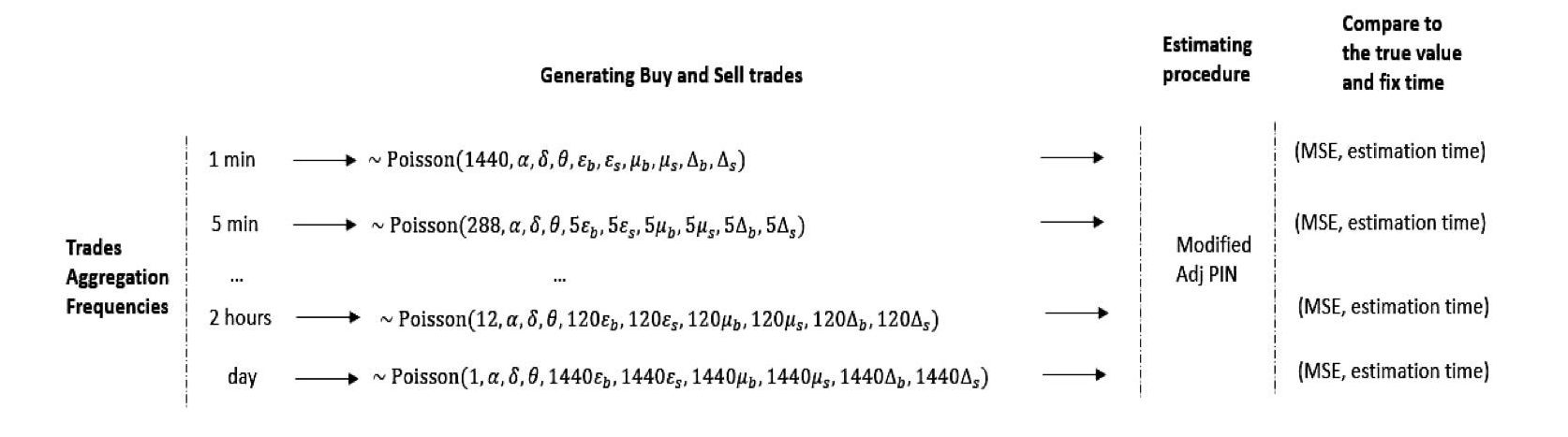 From Monte Carlo simulation in Section 5, we found that it is not optimal to go higher aggregating frequency than 15 minutes for both PIN and APIN models. According to our theoretical results, we expect to obtain more or less the same outputs for "medium" frequencies (2 hours to 15–30 min), which means we can use lower frequency to decrease estimation time without sacrificing much in accuracy.