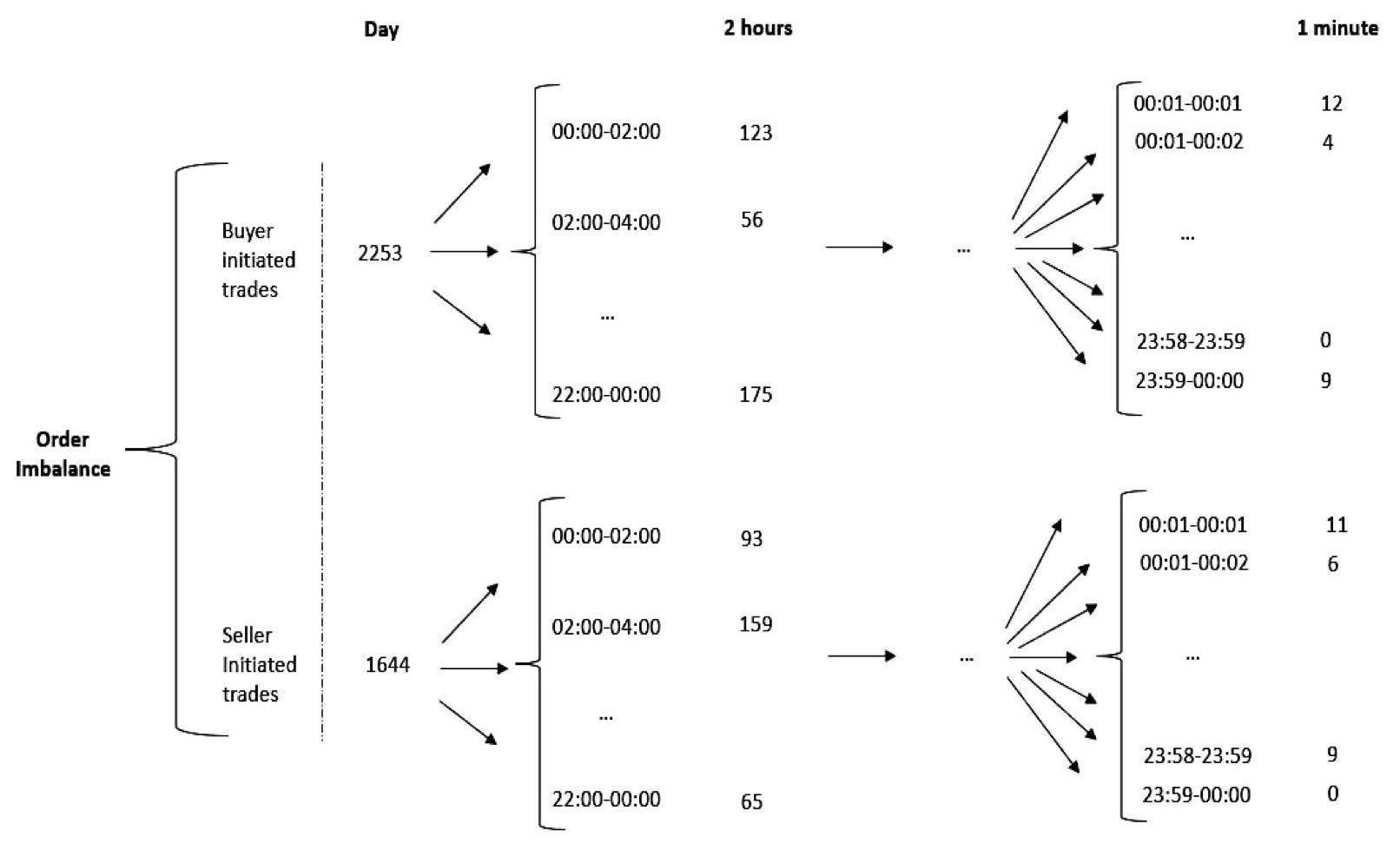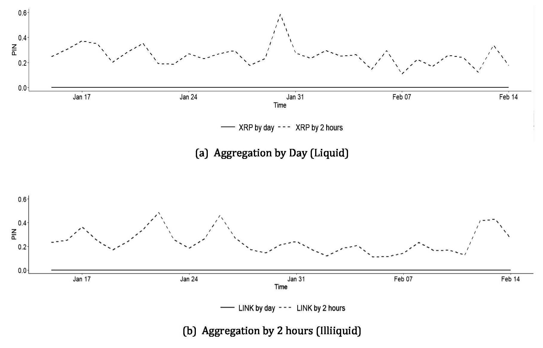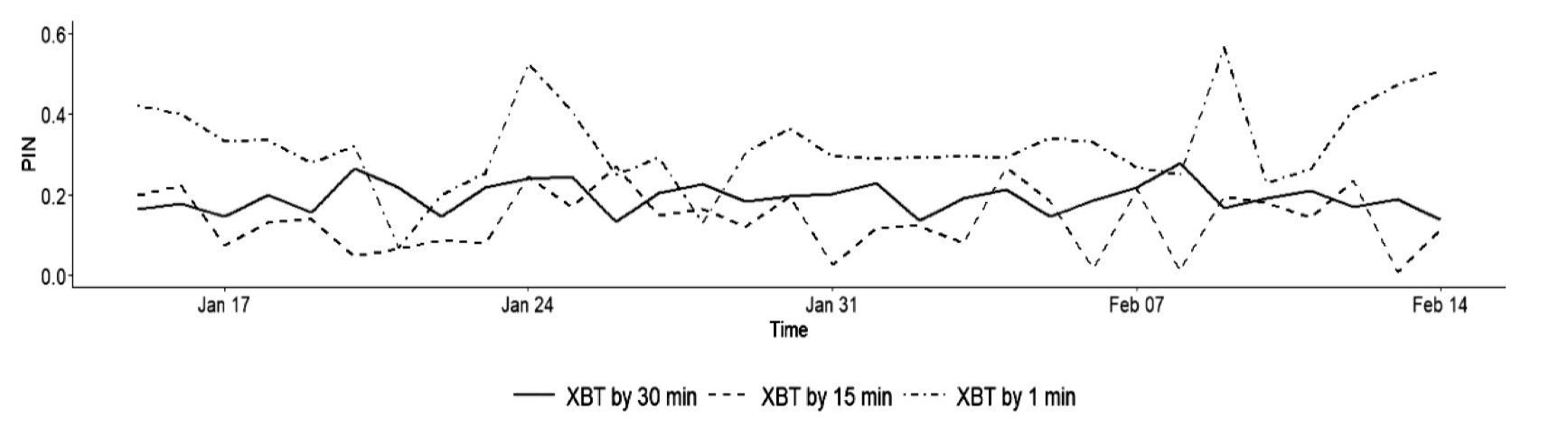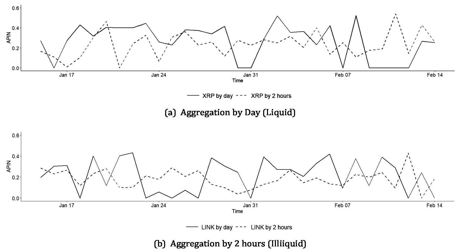 culty. Empirical series of both PIN and APIN prove that using higher frequency aggregation that one day provides more meaningful output, however, the behavior of the metrics at higher frequencies can vary due to potentially arising heterogeneity in the order flow and inability to determine at which exact frequency sophisticated algorithms are more likely to trade. We sidestep discussions regarding the PIN’s theoretical drawbacks and the ongoing theoretical discourse on whether solely analyzing order imbalance suffices is enough to detect informed trading, as well as the usage of alternative methodologies.