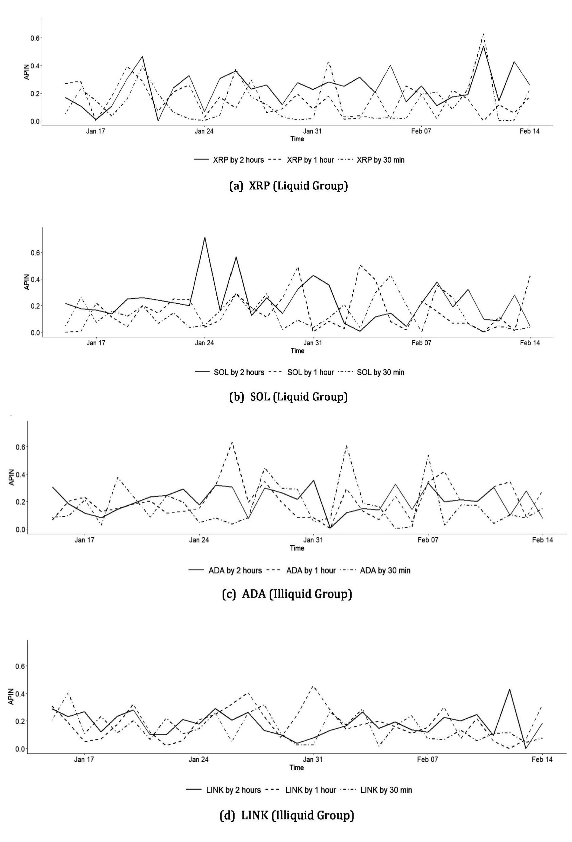 Fig. 13. APIN (Aggregation of trades by 2 hours vs 1 hour vs 30 minutes)