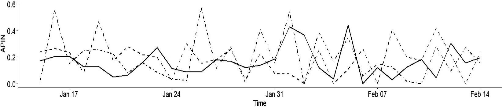 As for APIN, from Fig. 13 we can infer that the notion of medium frequencies of data aggregation being similar still holds, however, to a lower extent. There is some degree of prevailing similarity in behavior, while at different moments of time series diverge from each other. This further proves the frequency puzzle we described before. Various aggregation frequencies might make the resulting order imbalance more or less heterogeneous and exante we do not know at which frequencies informed trades are executed: they might be every hour or every 5 minutes. That it is why, 1 hour trades aggregation could be slightly different from 2 hour and 30 minutes aggregation, since informed activity might happen at the first frequency and not at the latter ones. We will elaborate further on this discussion in further sections.
