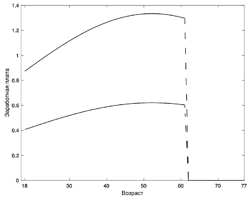 В предыдущей статье [Шпилевая и др., 2023] была формализована модель перекрывающихся поколений с гетерогенными предпочтениями и сектором высшего образования для репрезентативной страны, где сдается единый государственный экзамен (ЕГЭ). В модель включены 4 блока: индивиды, фирмы, образовательное учреждение и государство. Мы рассматриваем поведение индивидов, начиная с момента окончания ими среднего общего образования и сдачи ЕГЭ. В начале жизни индивиды принимают эндогенное решение об уровне образования. В рамках серьезных упрощающих предпосылок рассматривается только два уровня образования: среднее и высшее (бакалавриат) без разделения на среднее общее и среднее специальное. В течение жизни индивиды накапливают активы, на которые живут в нетрудоспособном возрасте. Альтруистические связи между поколениями отсутствуют, все индивиды в начале жизни обладают нулевыми активами. Фирмы производят блага и услуги в условиях конкуренции и максимизируют прибыль. Образовательное учреждение представляет всю систему образования в целом и не учитывает межвузовские и региональные различия в образовании, размеры вузов и их качество. Образовательное учреждение обеспечивает выпуск индивидов с высшим образованием. Государство взимает налоги, которые распределяет на трансферты и государственные расходы, а также обеспечивает финансирование бюджетных мест в вузе. Рассматриваемая модель является моделью закрытой экономики.
